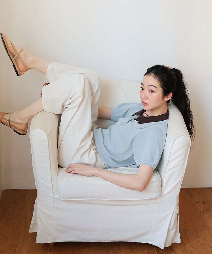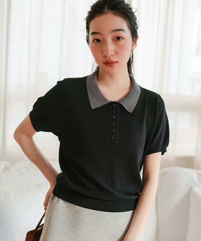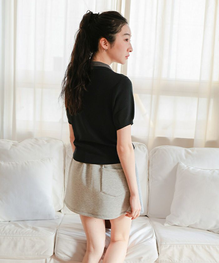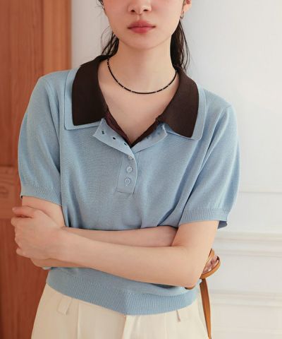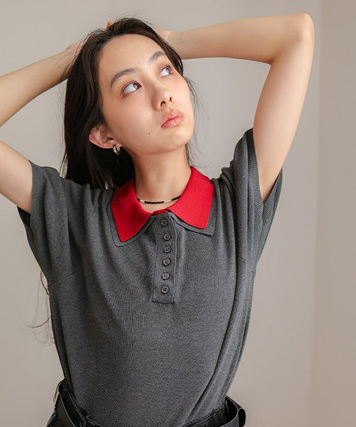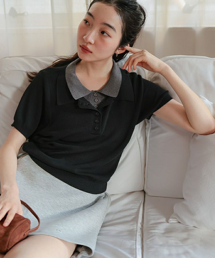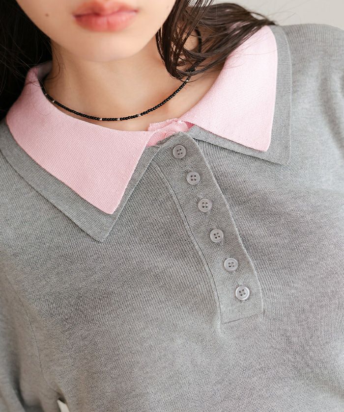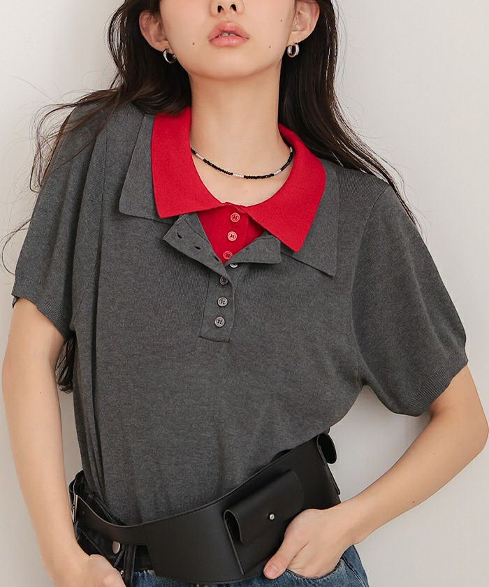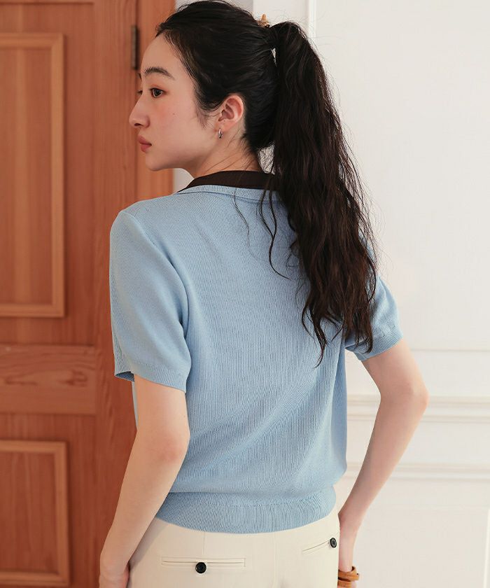 ・配色デザインの襟を重ねたような、レイヤード風デザインが目を惹く半袖ニット