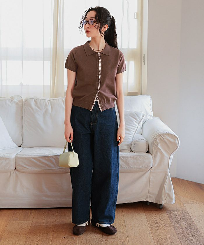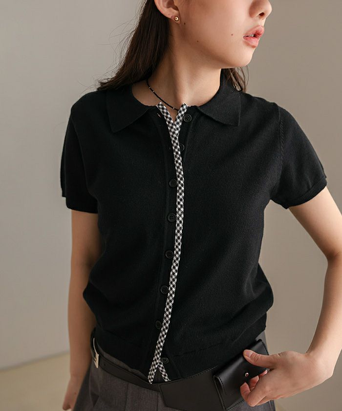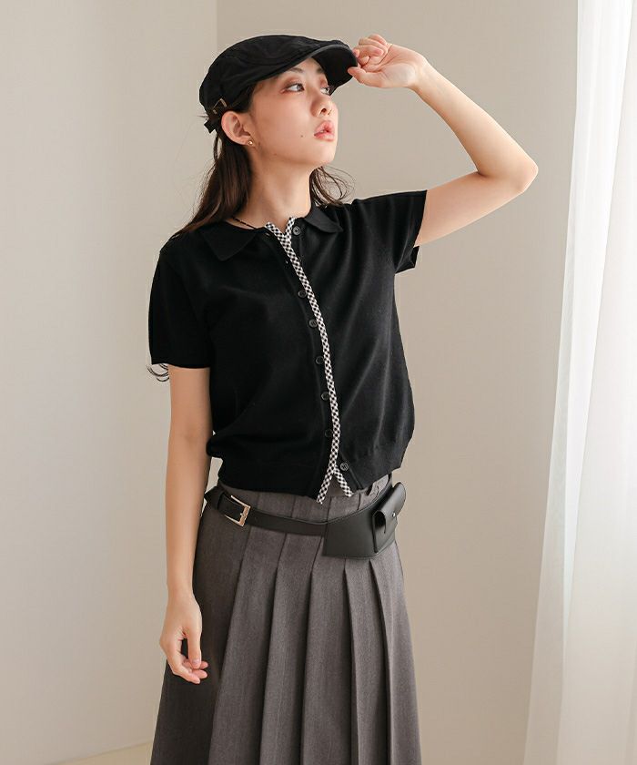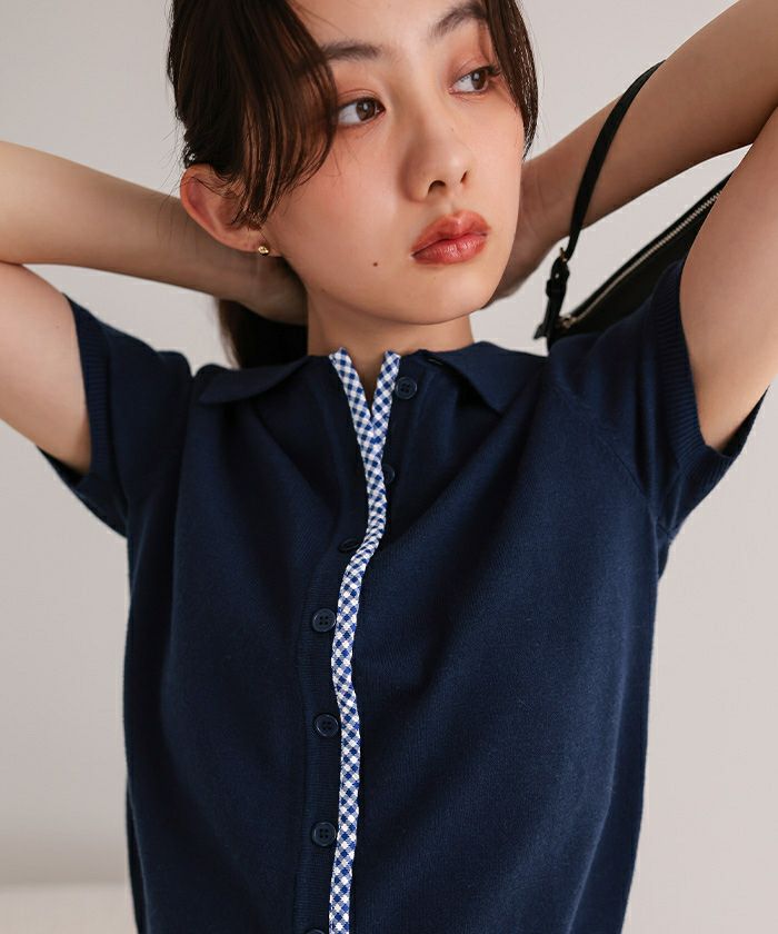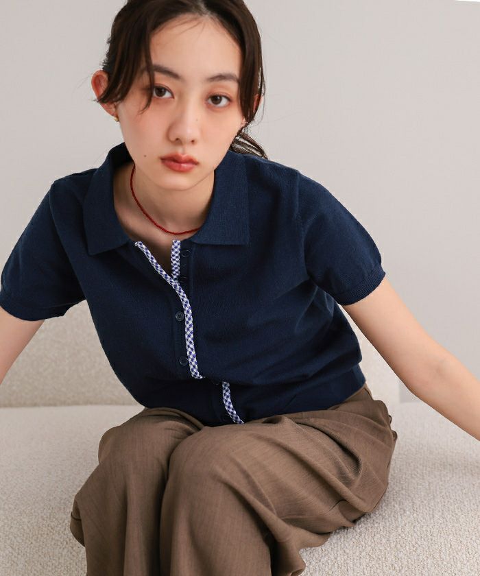 ・前端に施したチェック柄パイピングがポイントの半袖ニット