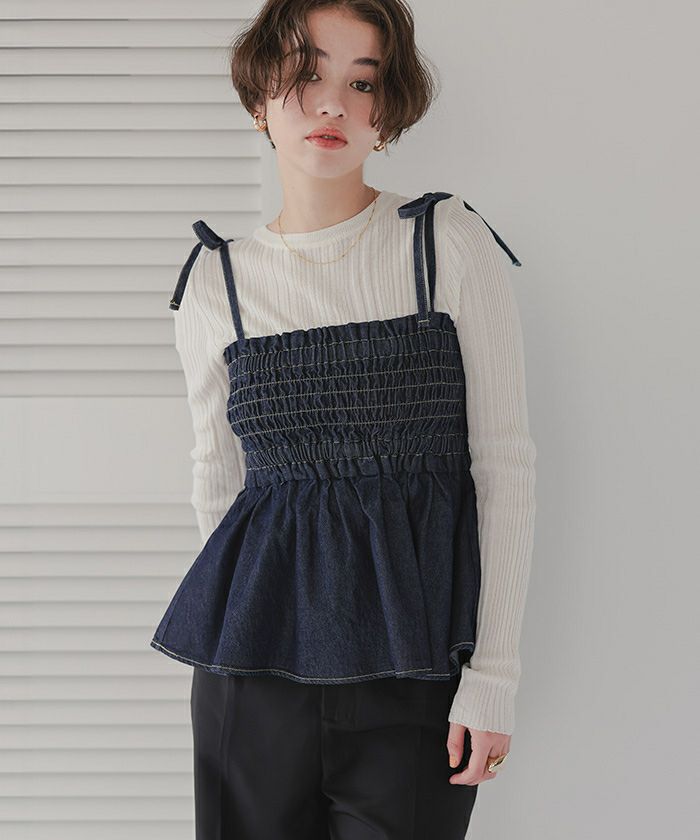 ・デニム素材なので華奢なストラップ×リボンでも甘過ぎず程良くカジュアルに着られる