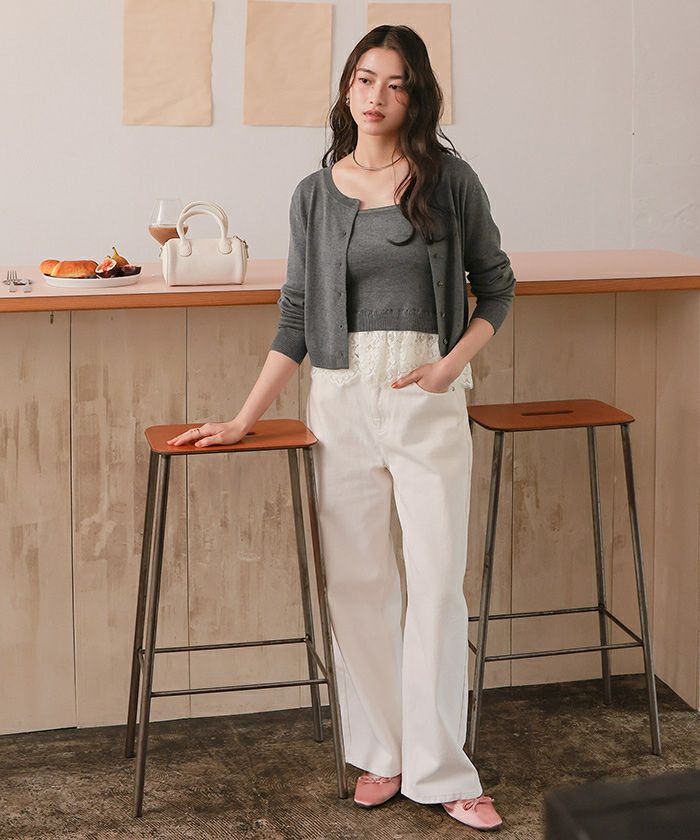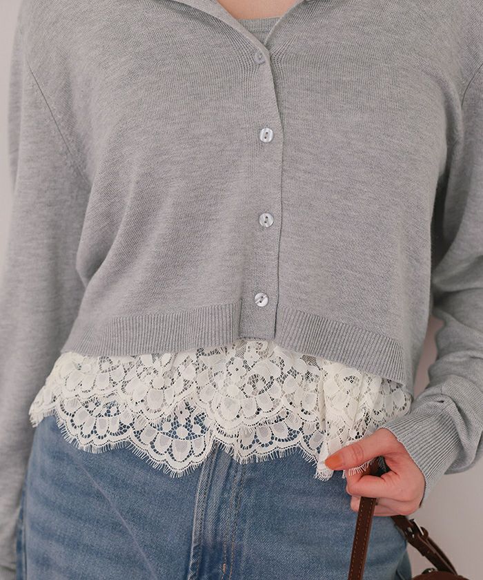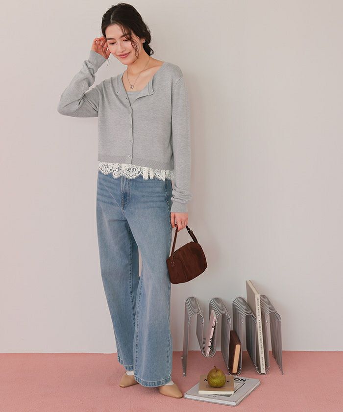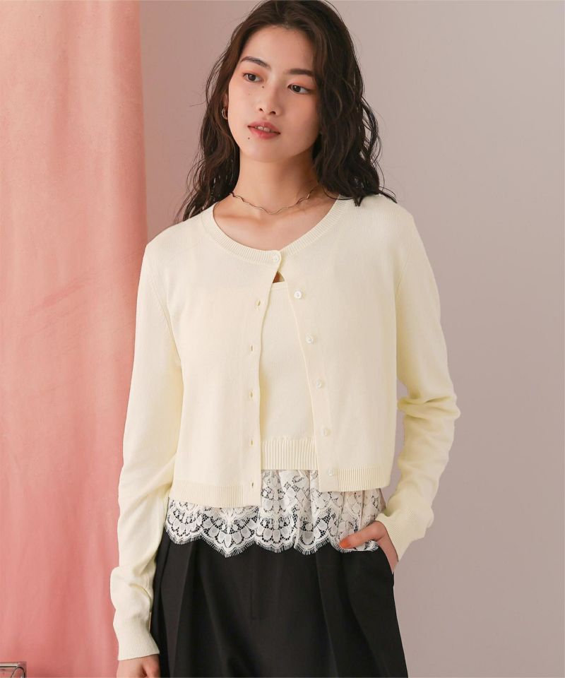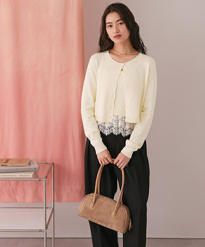 ・カーデはリラクシーなシルエットで、コンパクトすぎず、抜け感を演出。ボタンを留めれば裾からレースが覗く上品なルックに