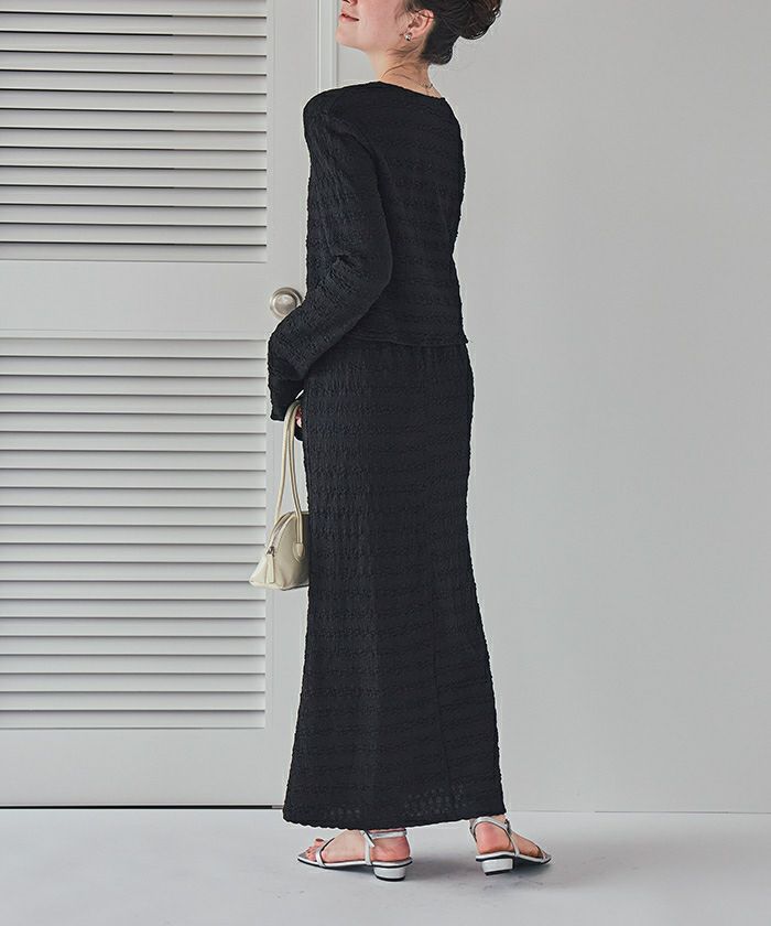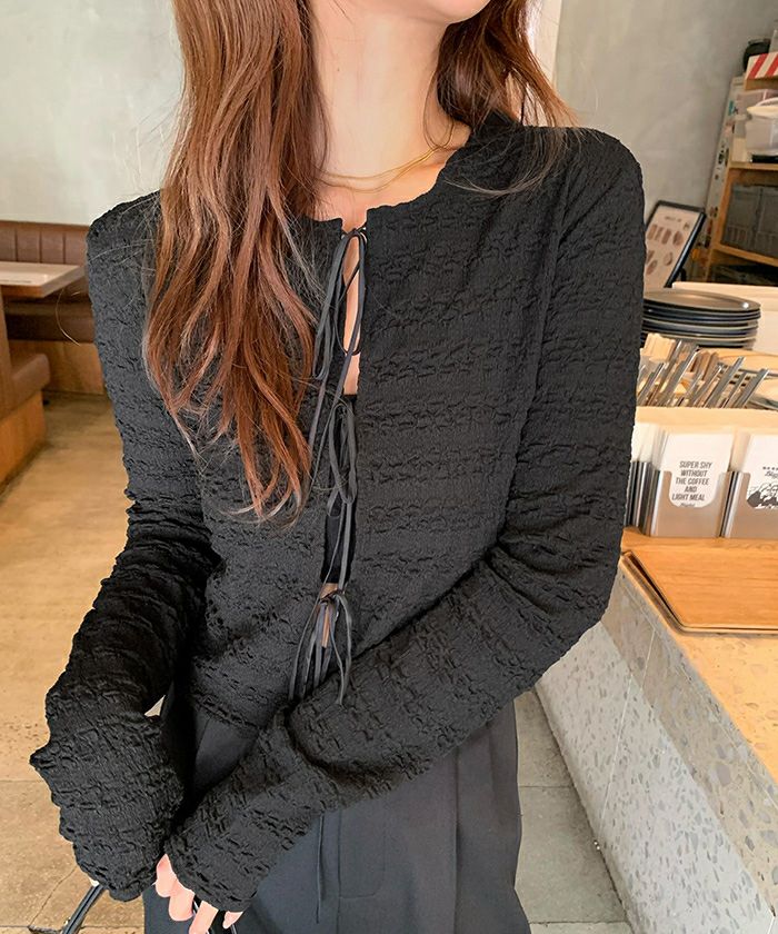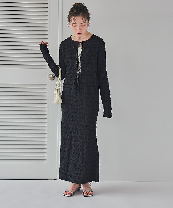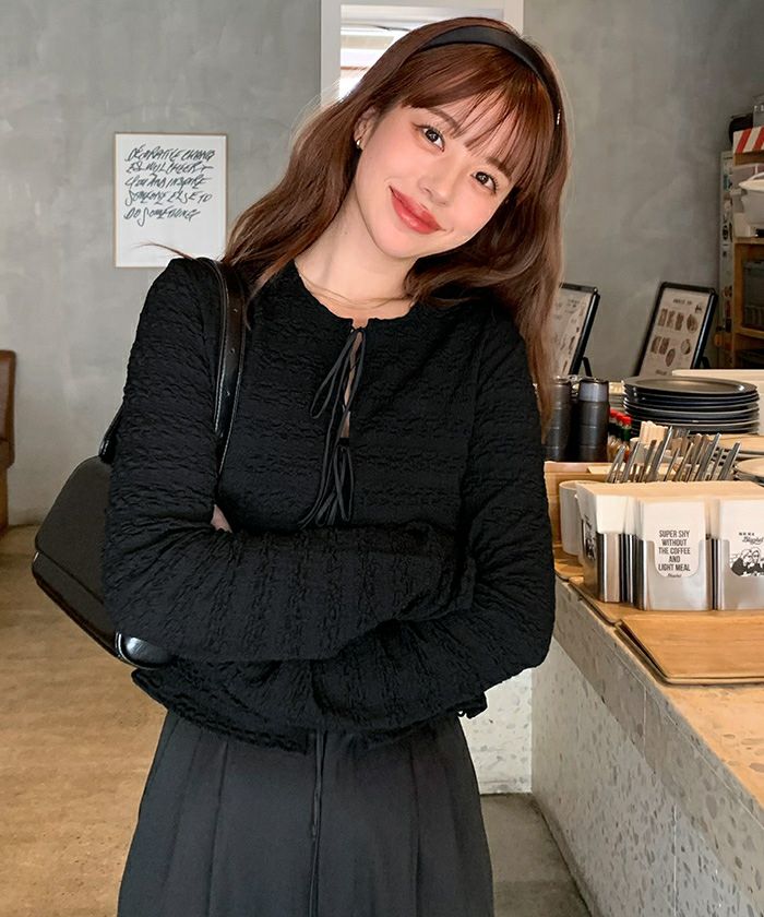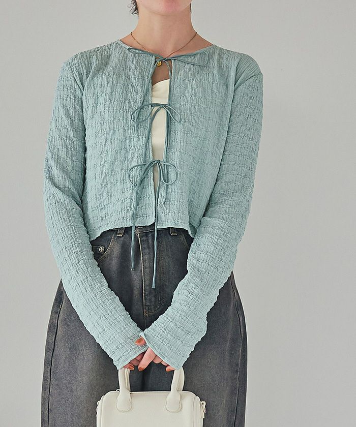3連リボンがかわいいアクセントになって、これ1枚で華やかな雰囲気がある主役級のアイテムです。 ジャカード生地なので、こなれた印象に仕上がります。