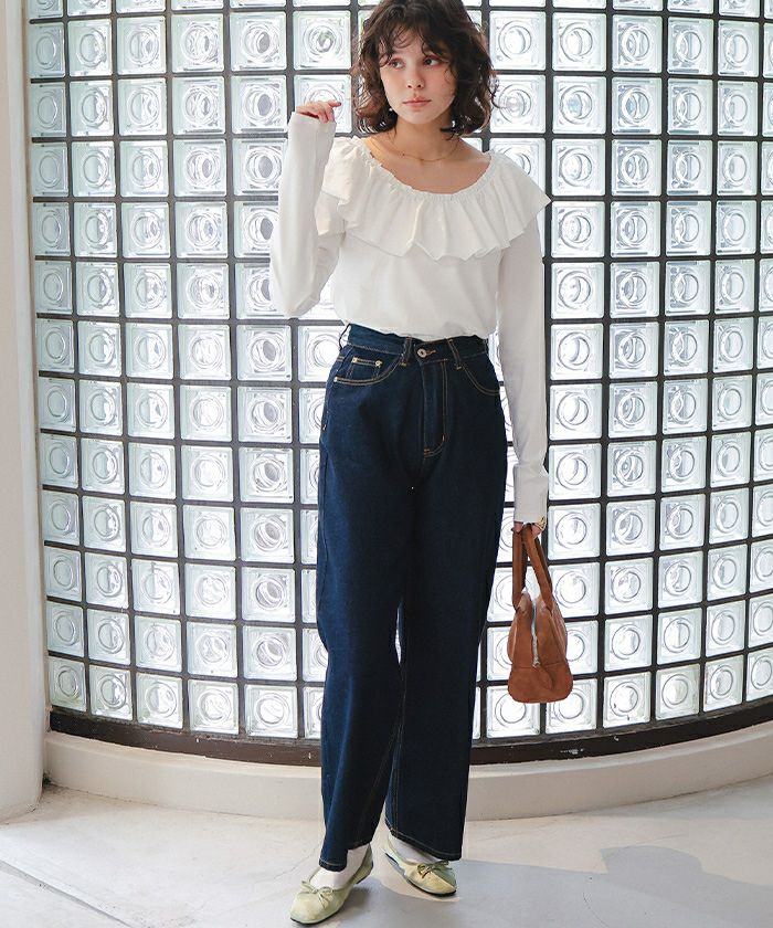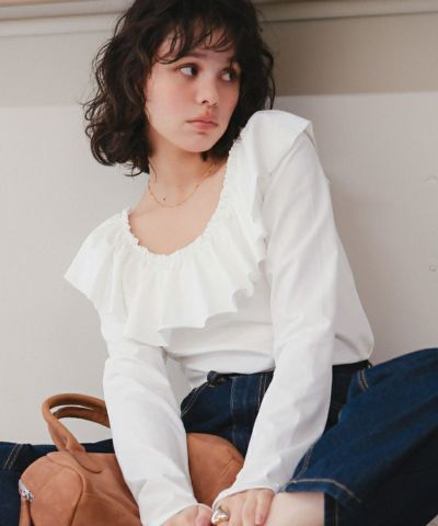 ・フリルデザインが視線を上げてくれるので、裾はボトムスにすっきりまとめると脚長効果◎