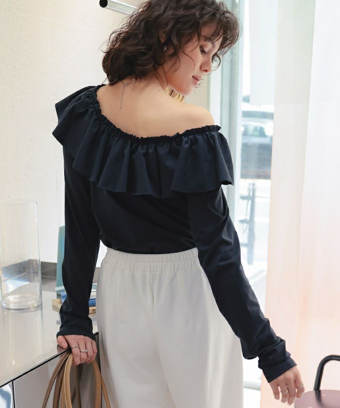 ・1枚で表情が変わる3WAY設計。ボートネックで上品に、オフショルで女っぽく、ワンショルでこなれムードに。前後どちらでもお好みで着用できるのも魅力。