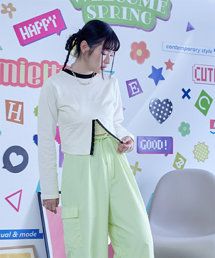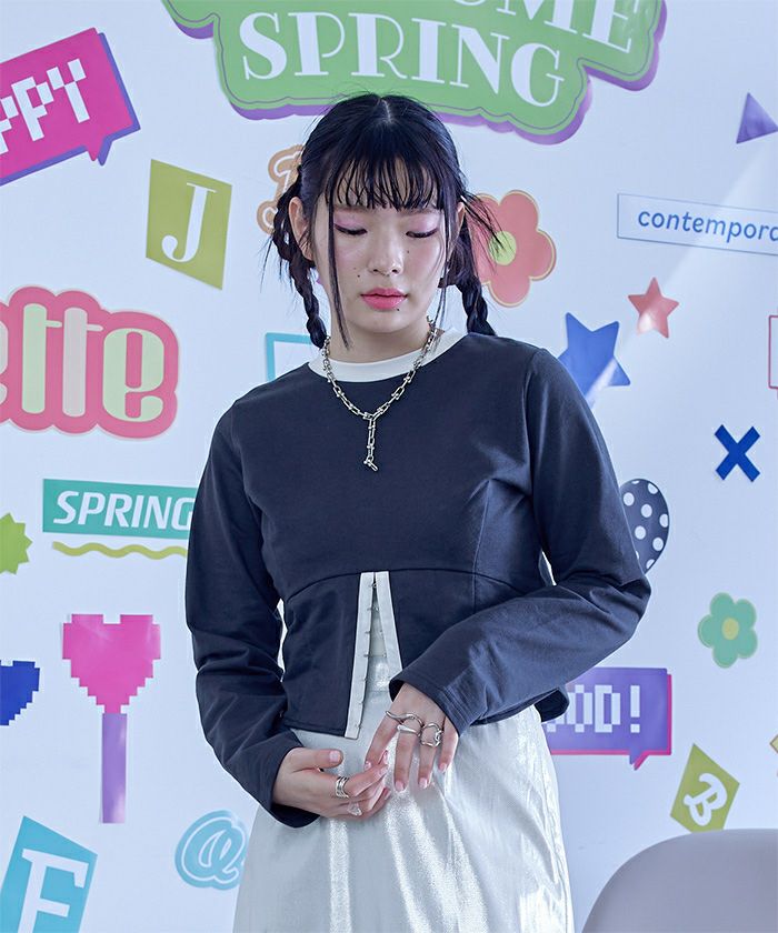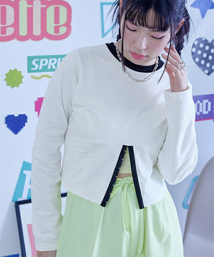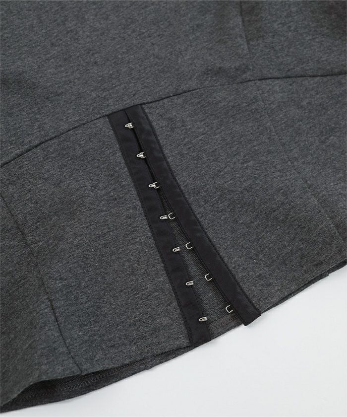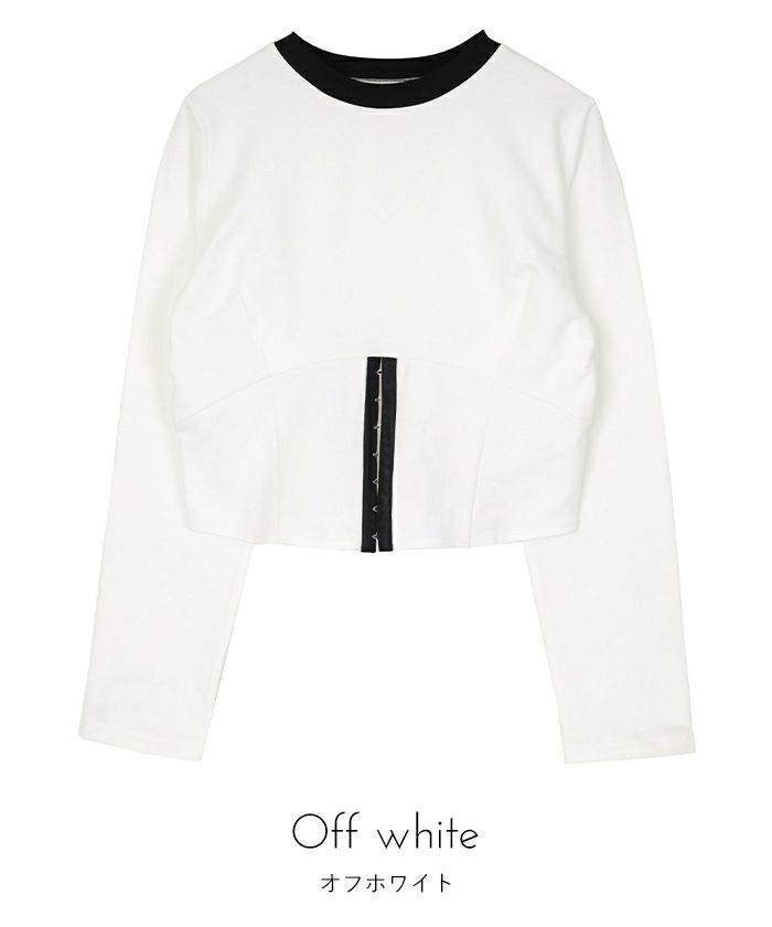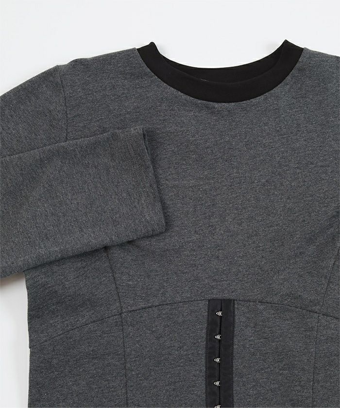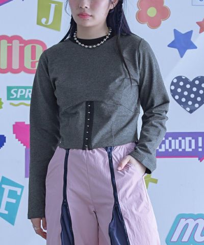 ・コルセットデザインがポイントのミニ裏毛トップス。