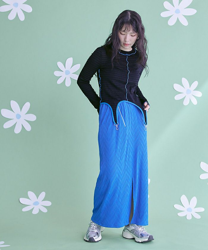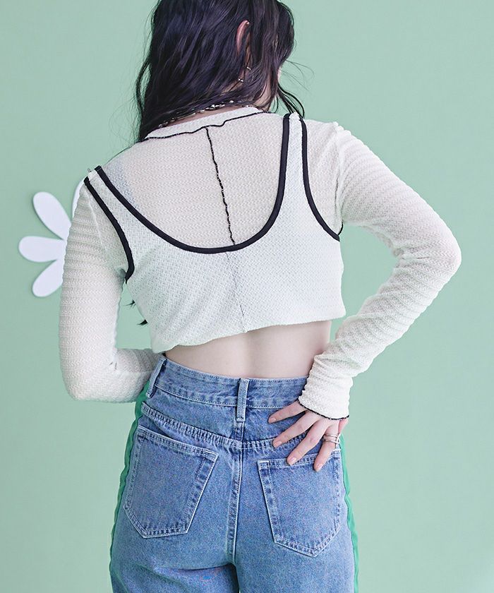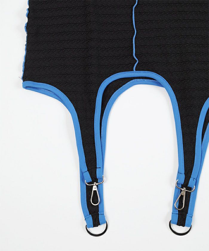 ・ウエストを折り返して、金具を止めてタンクトップのレイヤードデザインのようにも着用できます。(モデル参照)