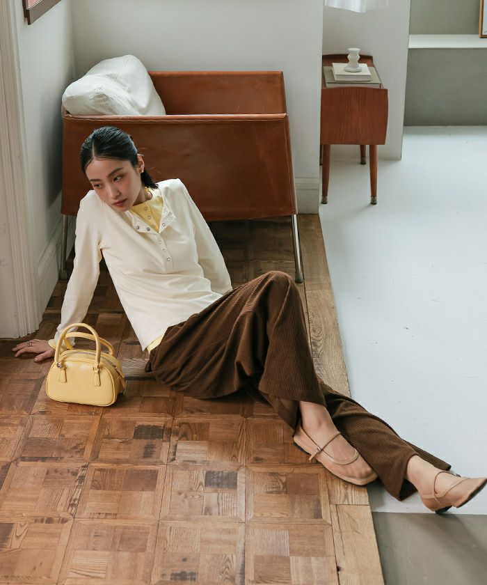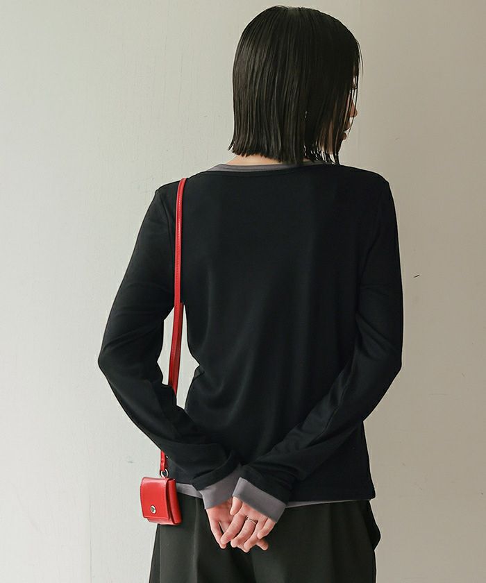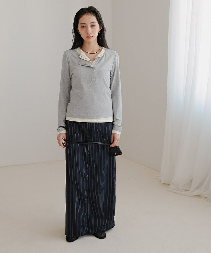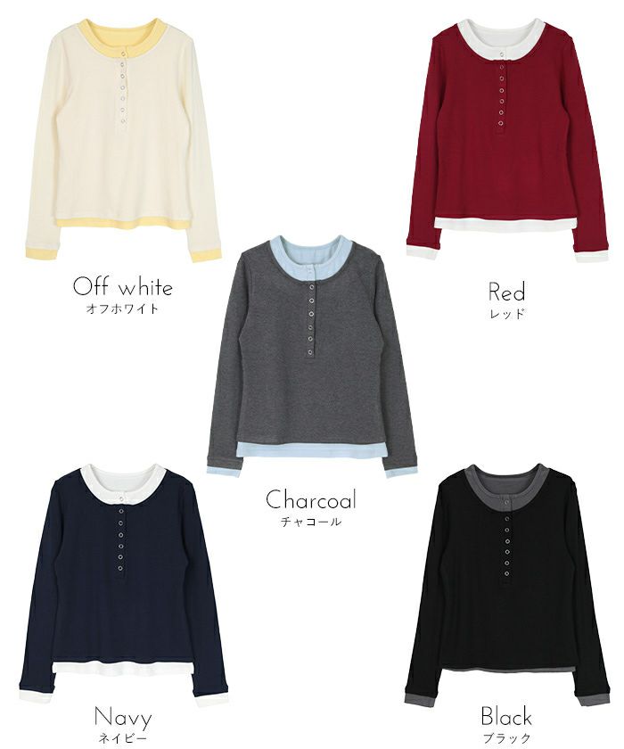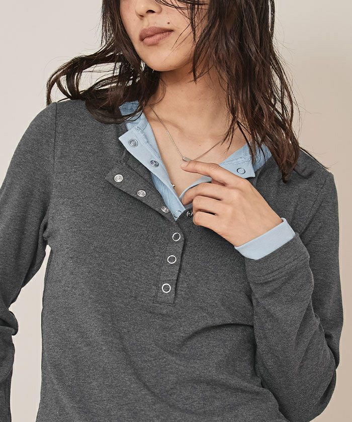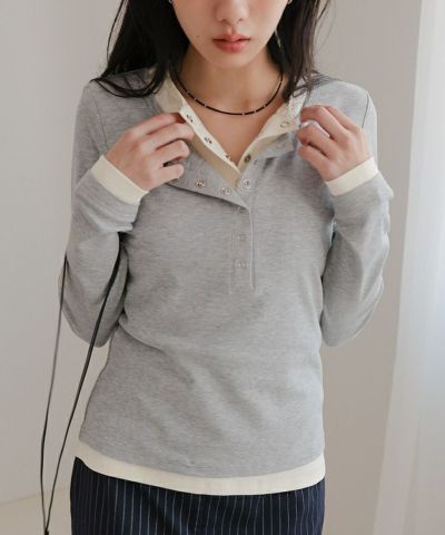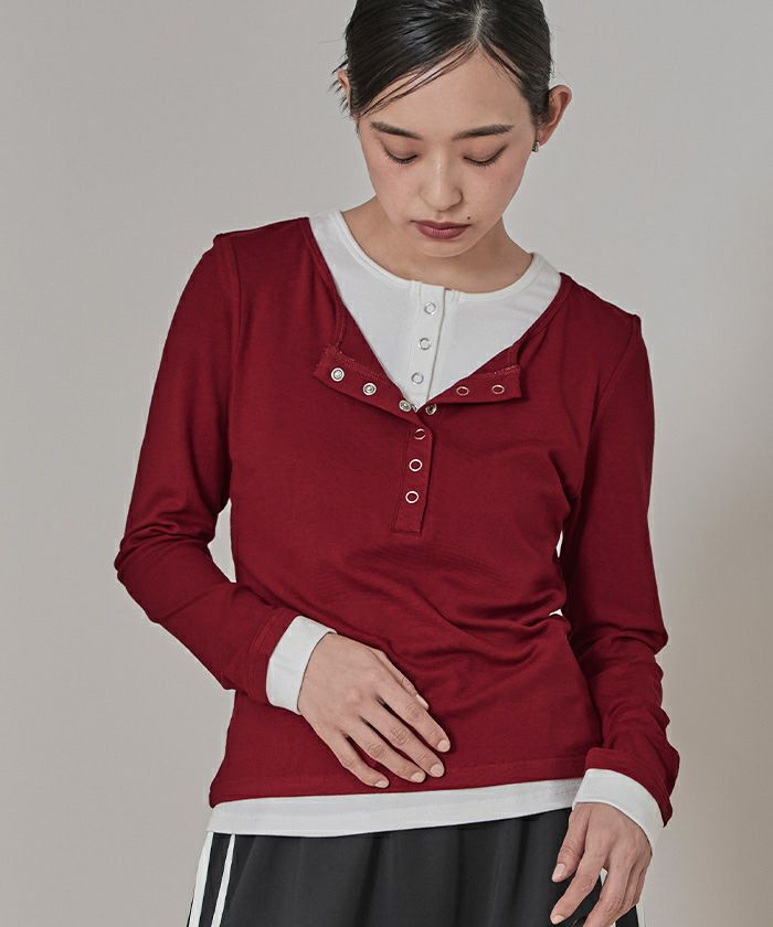 ・レイヤードスタイルを1枚で楽しめる、ヘンリーネックのトップス。