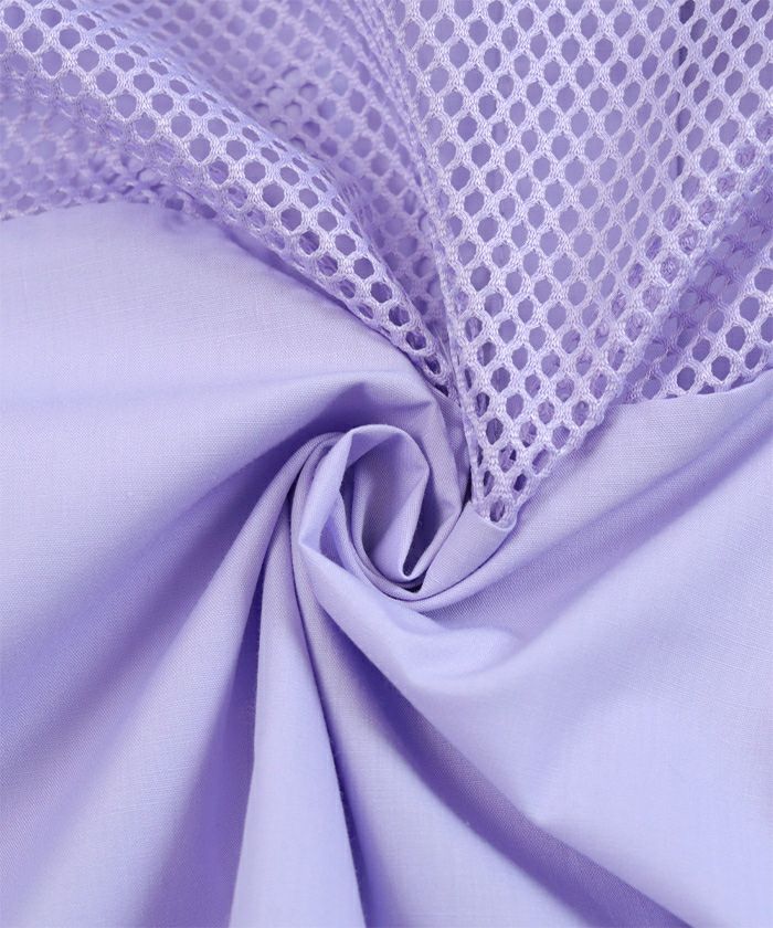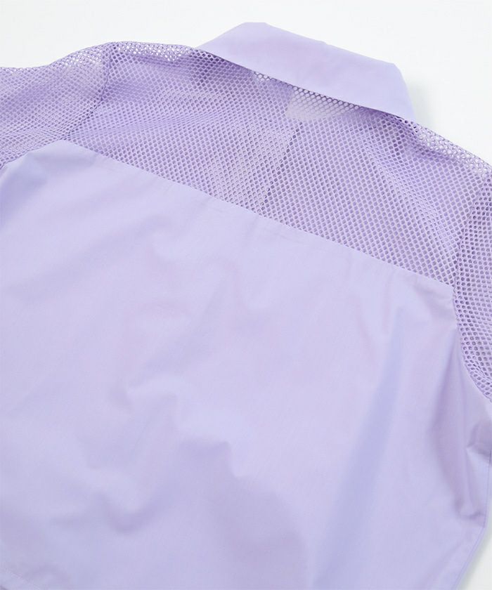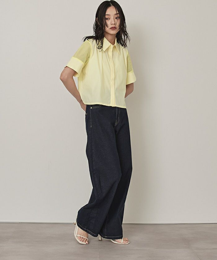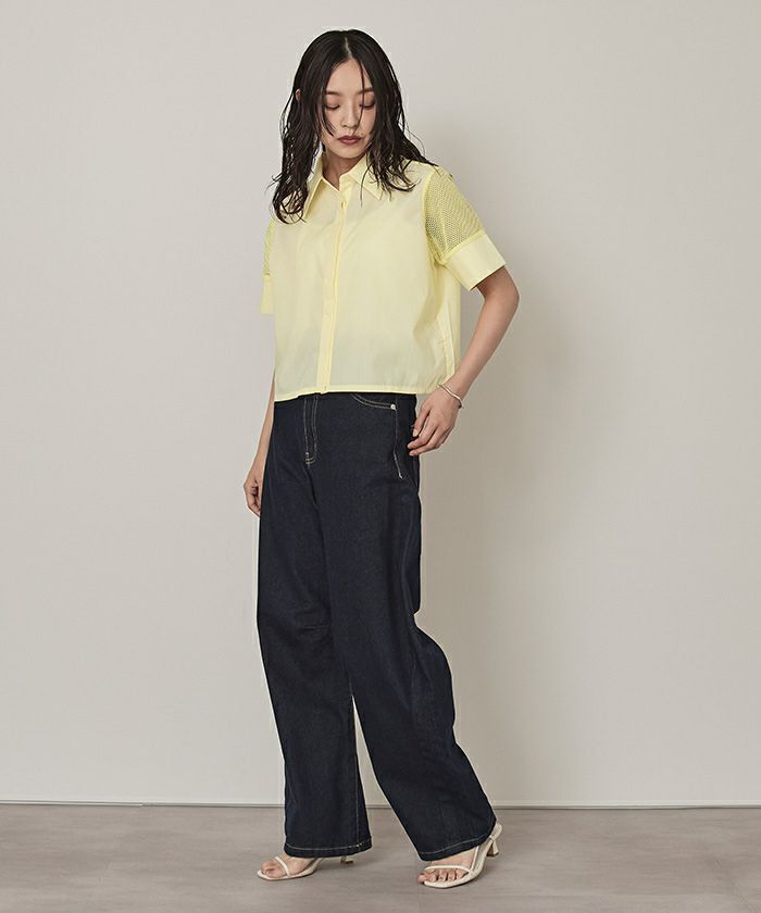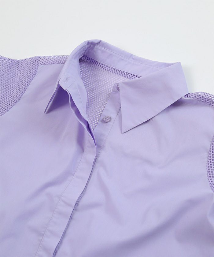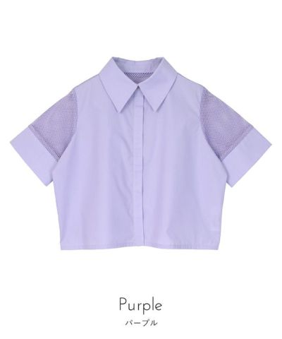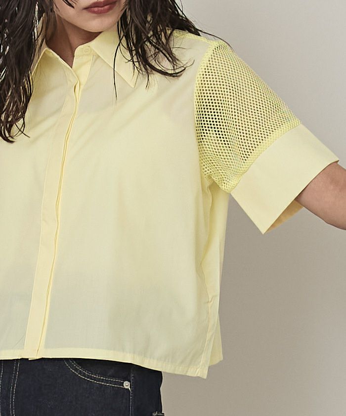 ・袖のメッシュ切替がアクセントになったシャツトップス。