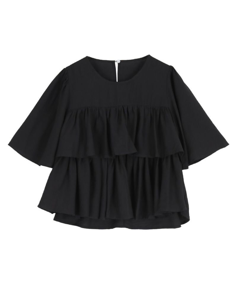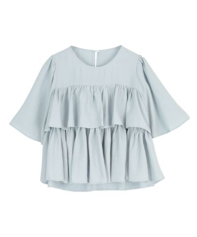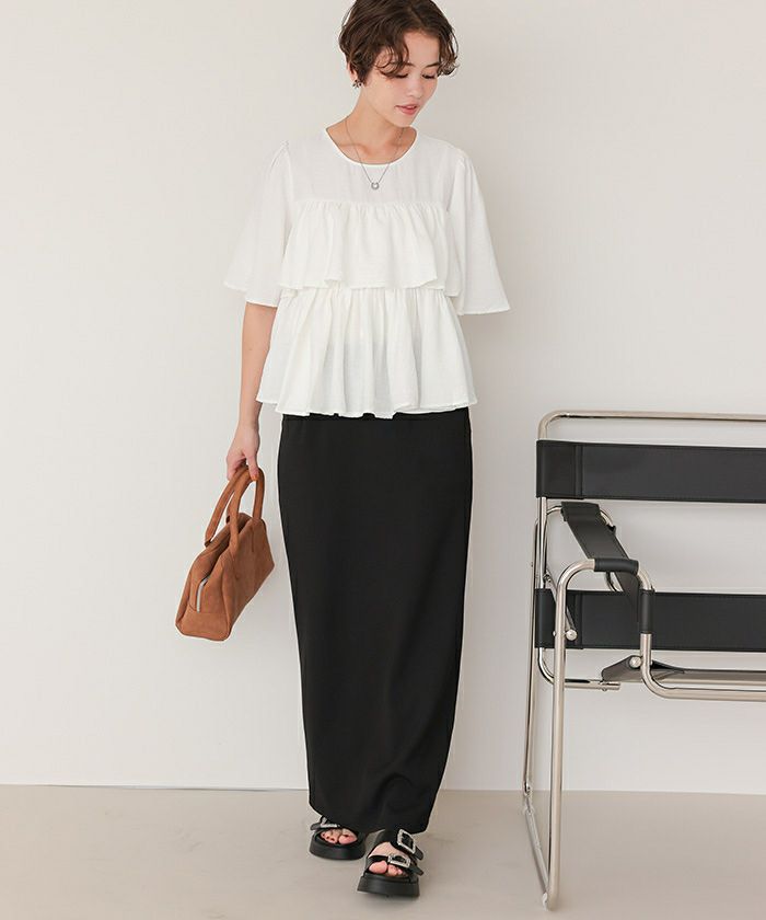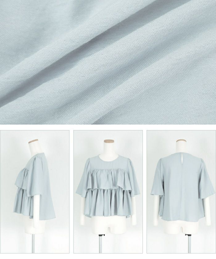 商品情報 ・フロントフリルと程よくフレア感のある袖デザインで体型カバー。
