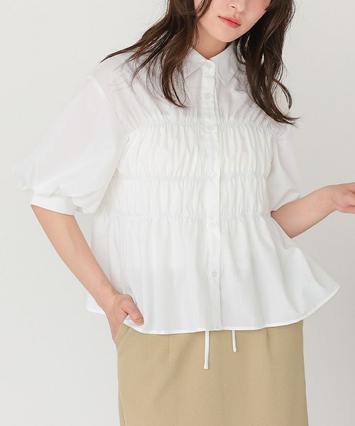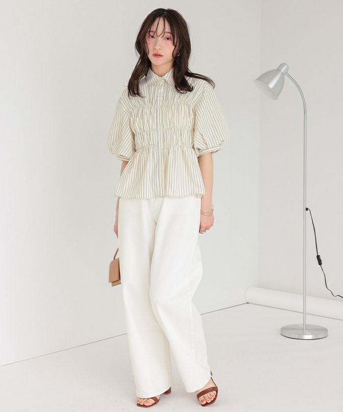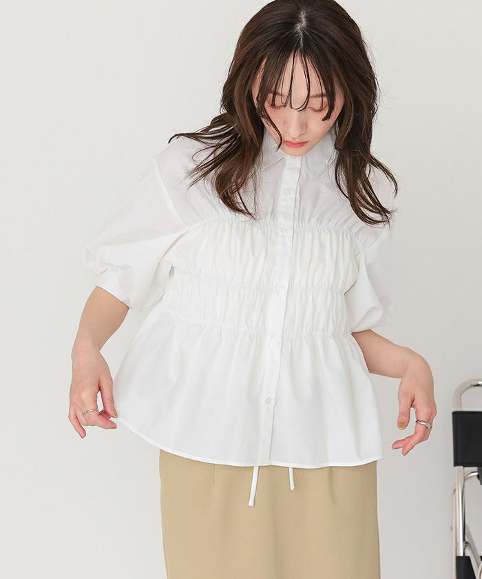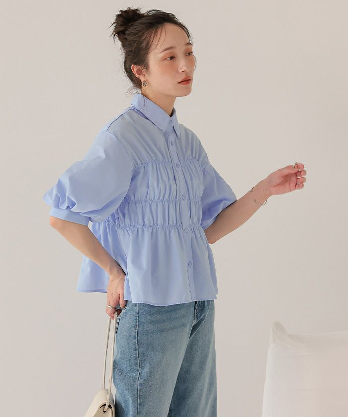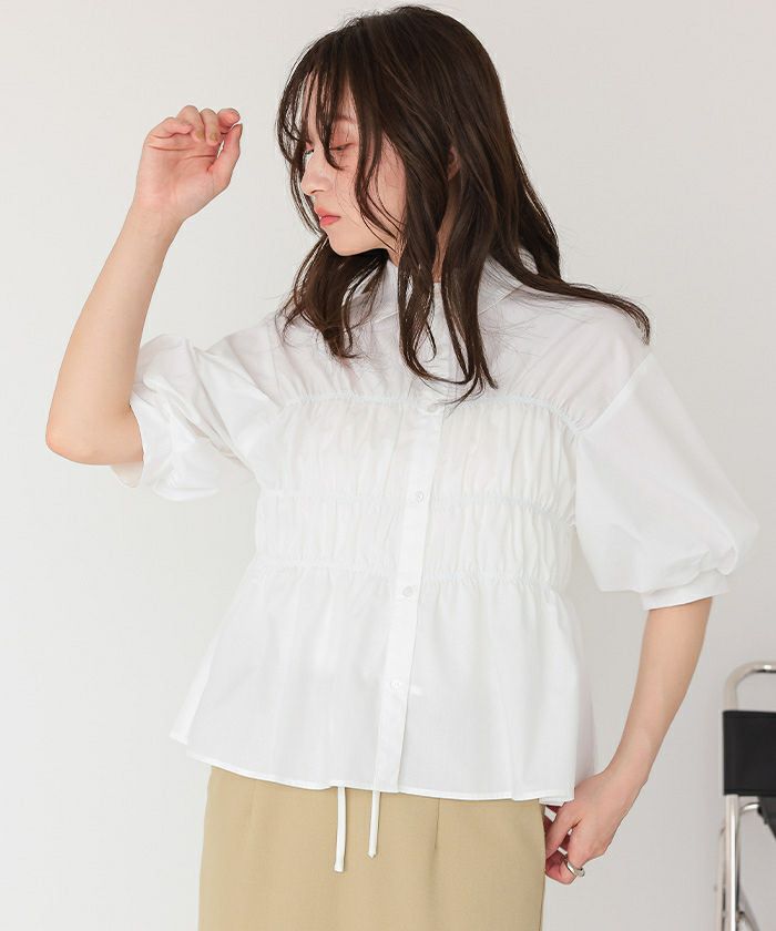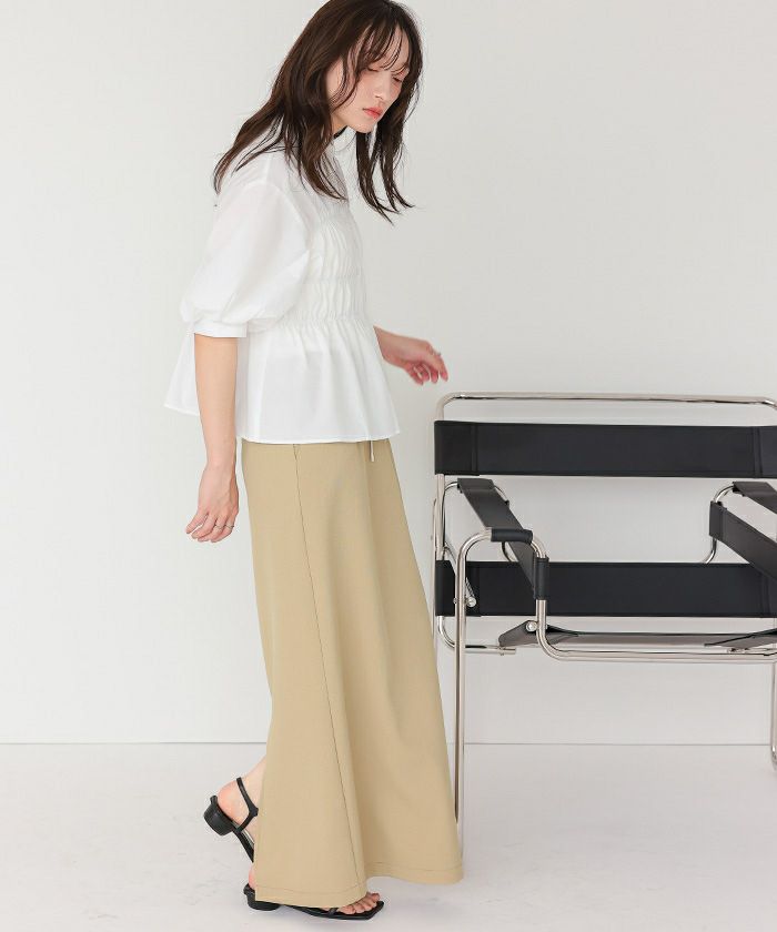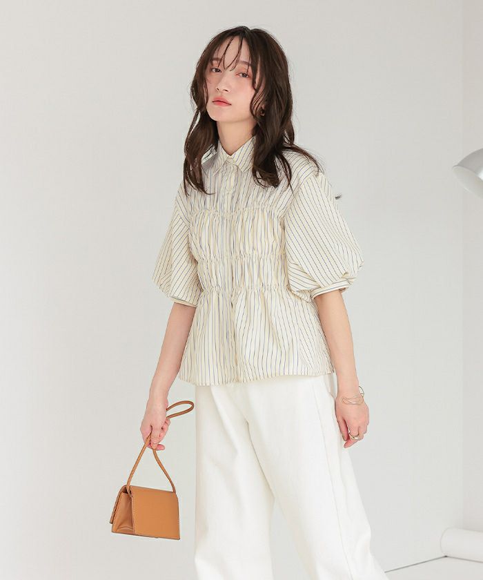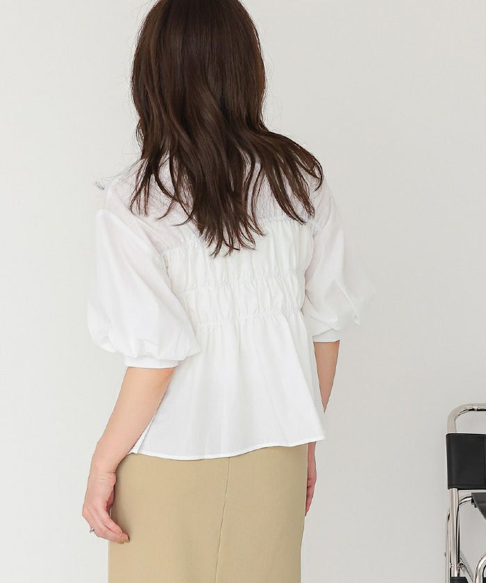 ・胸部のギャザーが自然にスタイルアップ効果をプラス。スカートにもパンツにも好相性