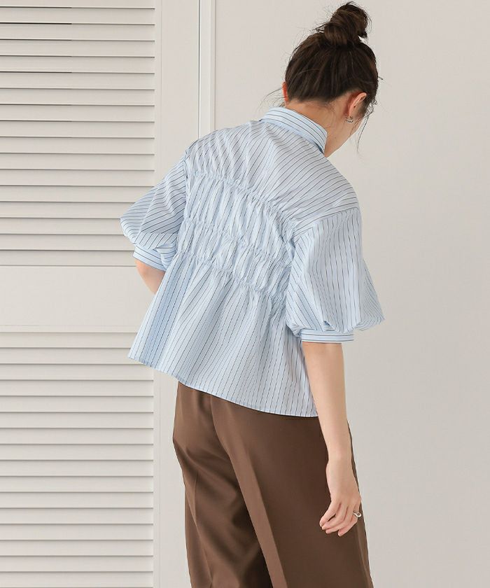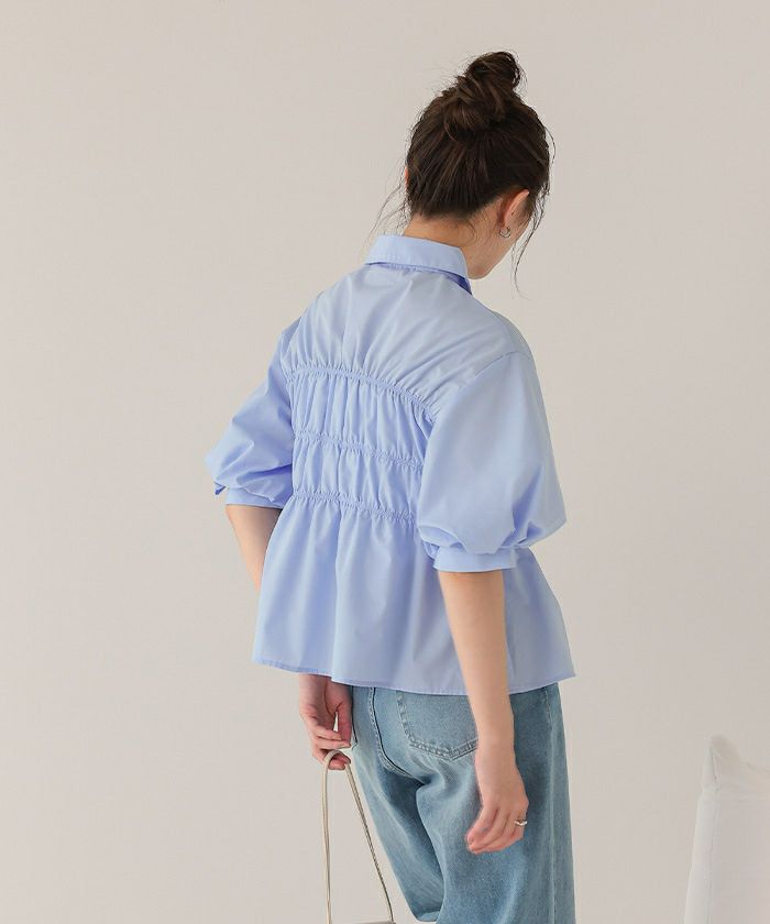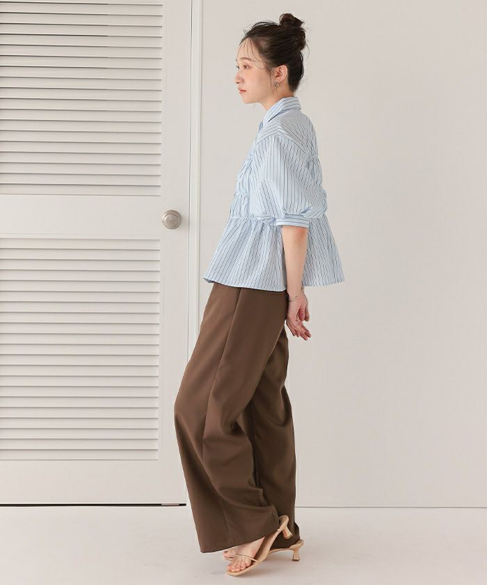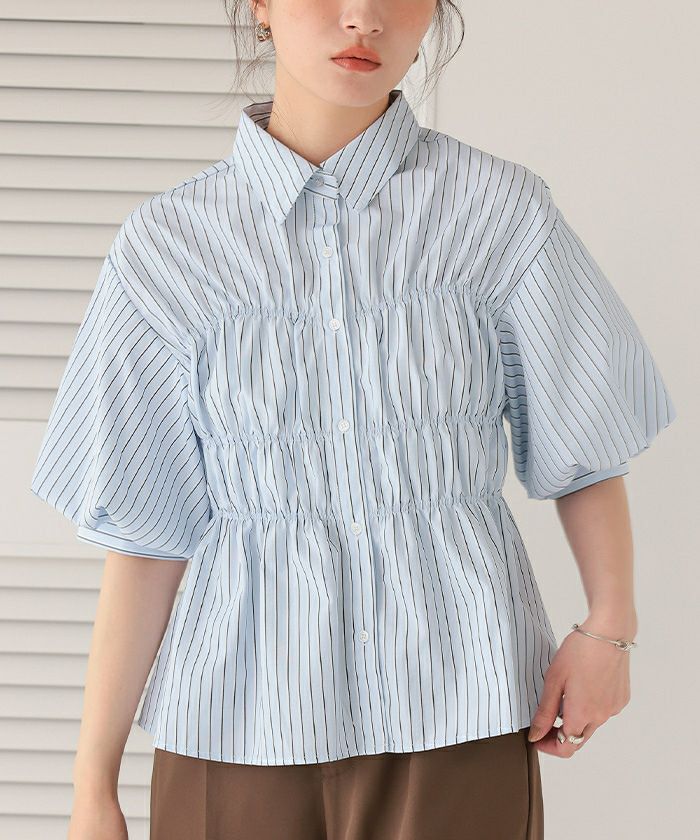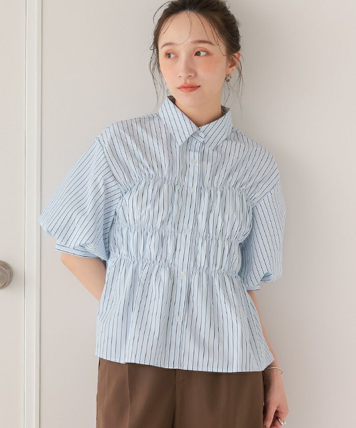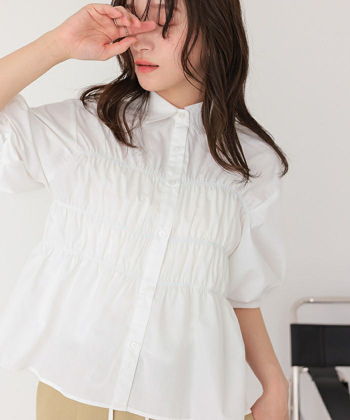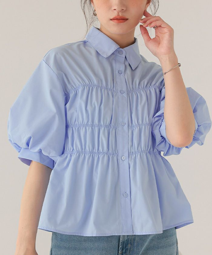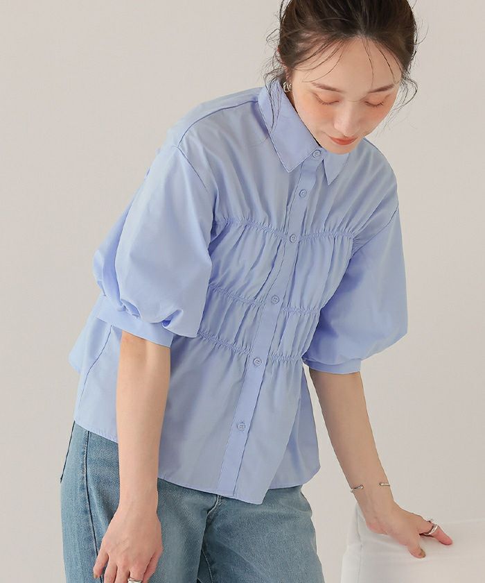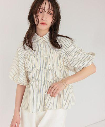 ・胸部のギャザーが自然にスタイルアップ効果をプラス。スカートにもパンツにも好相性