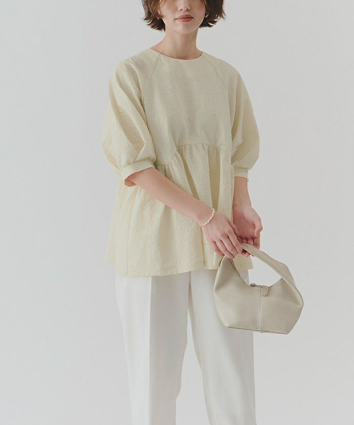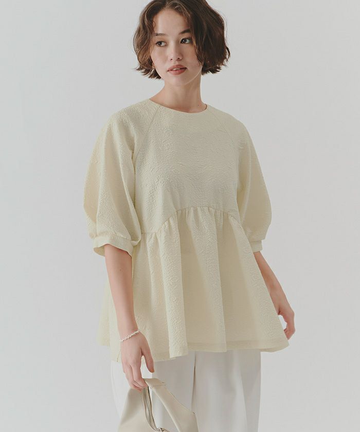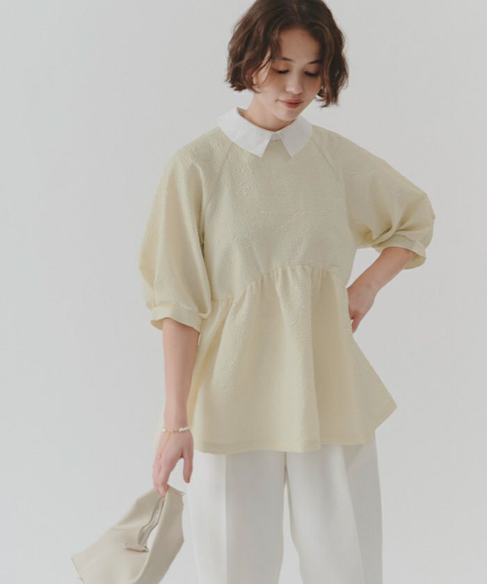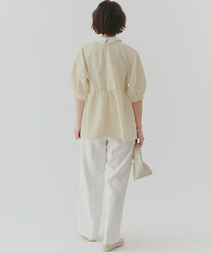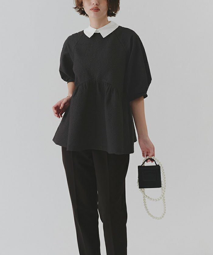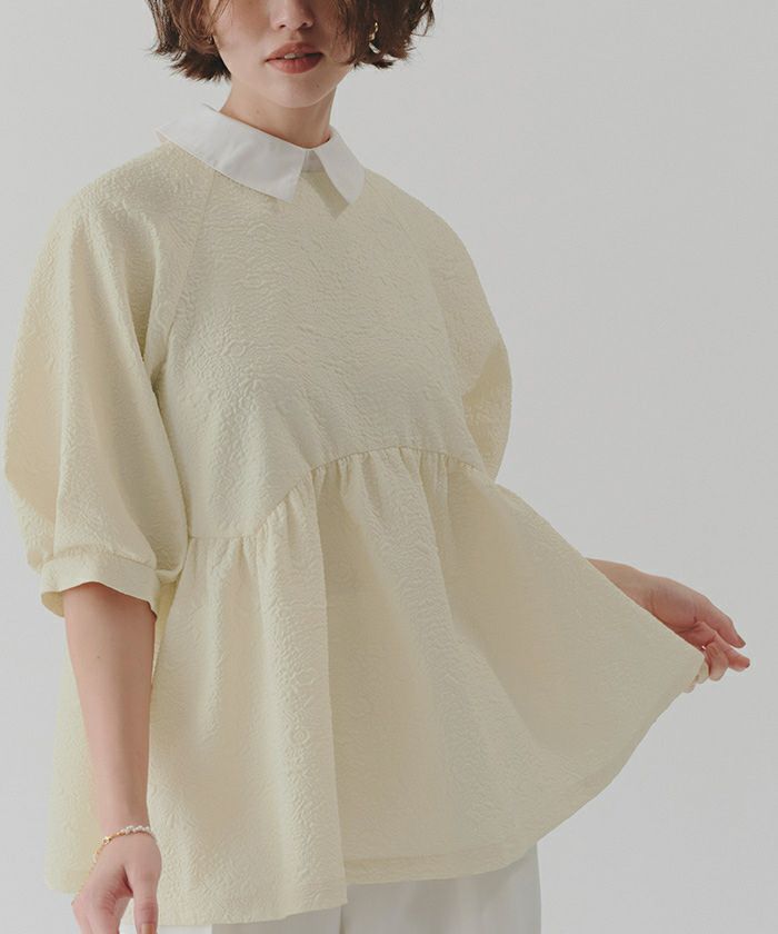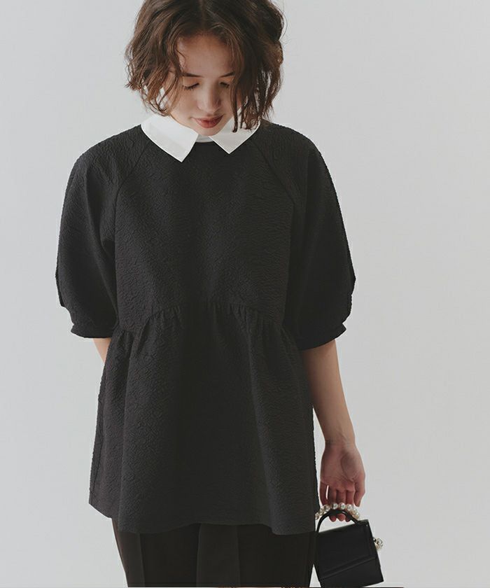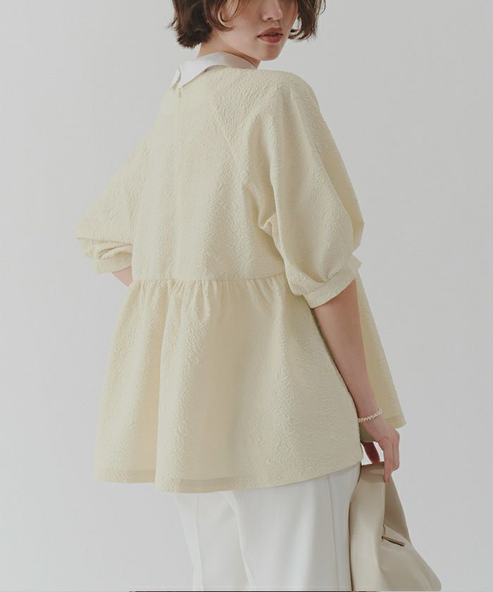 ・ふくれジャガード生地で仕上げた、パフスリーブと身頃のペプラムでメリハリのあるシルエットか完成する襟付きブラウス。