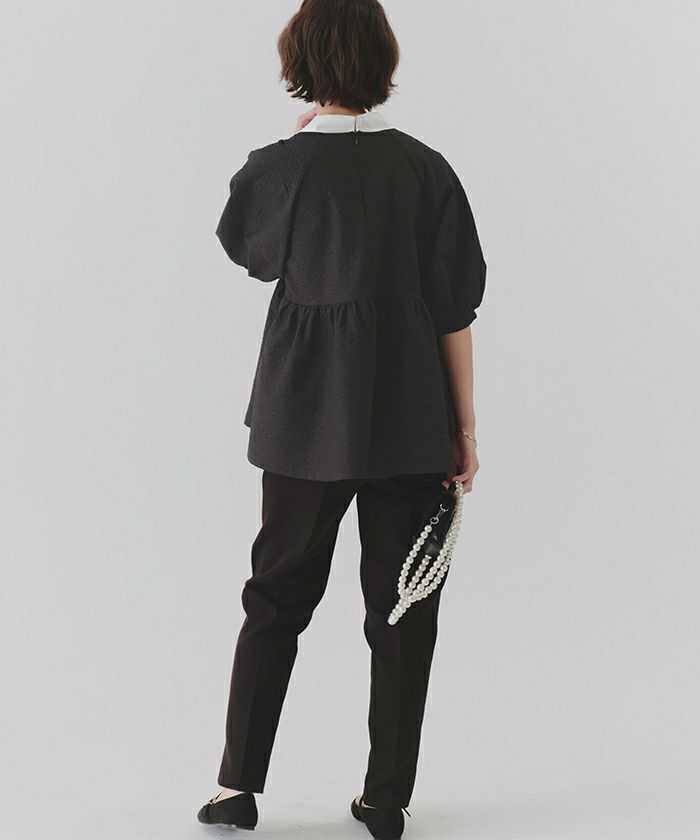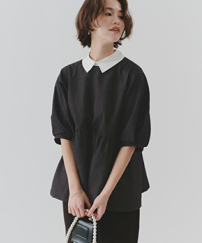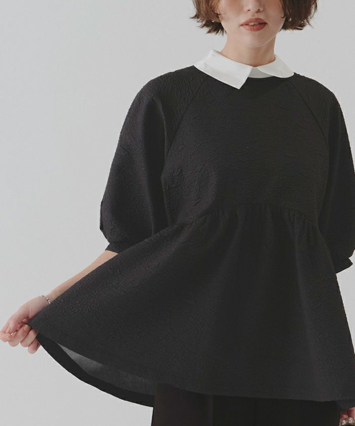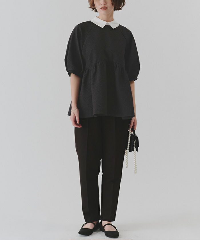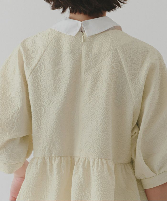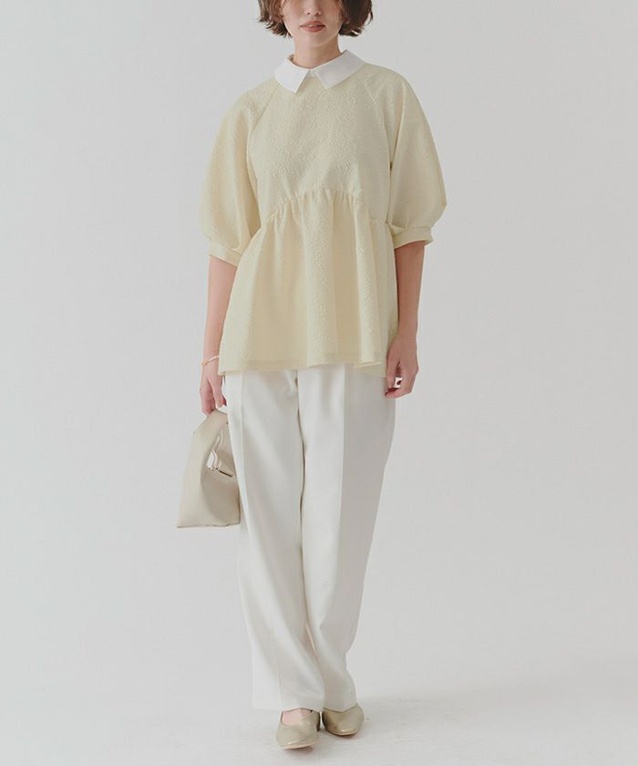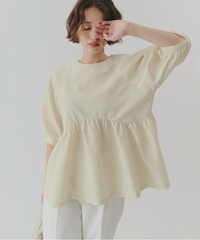 ・ふくれジャガード生地で仕上げた、パフスリーブと身頃のペプラムでメリハリのあるシルエットか完成する襟付きブラウス。