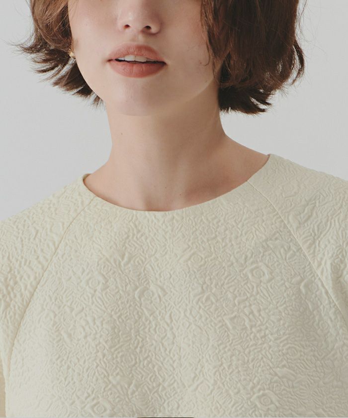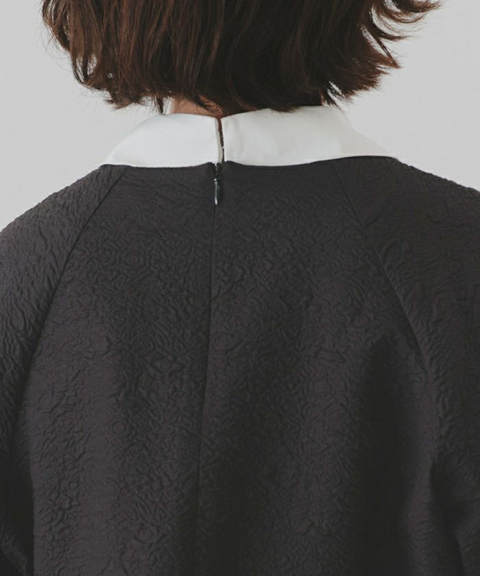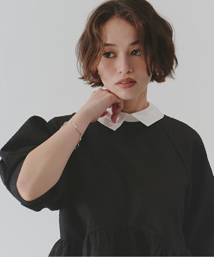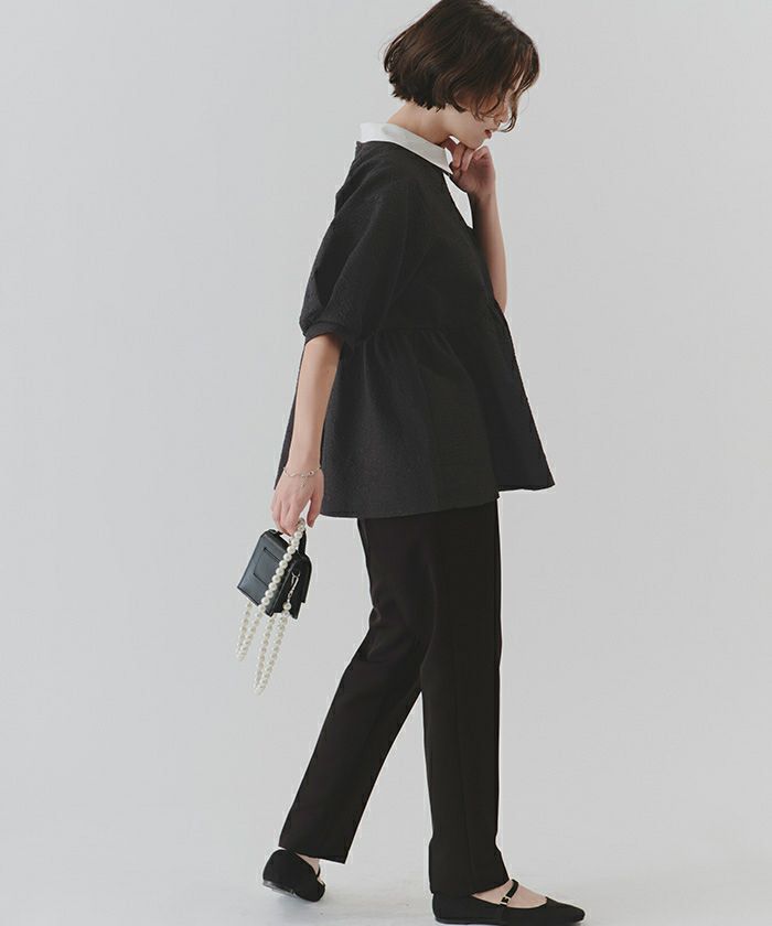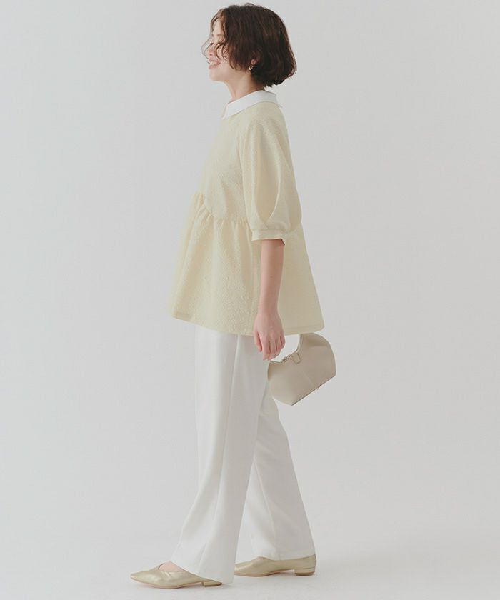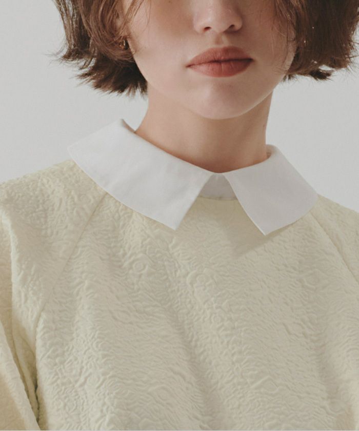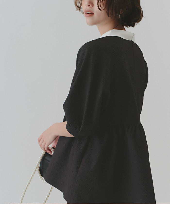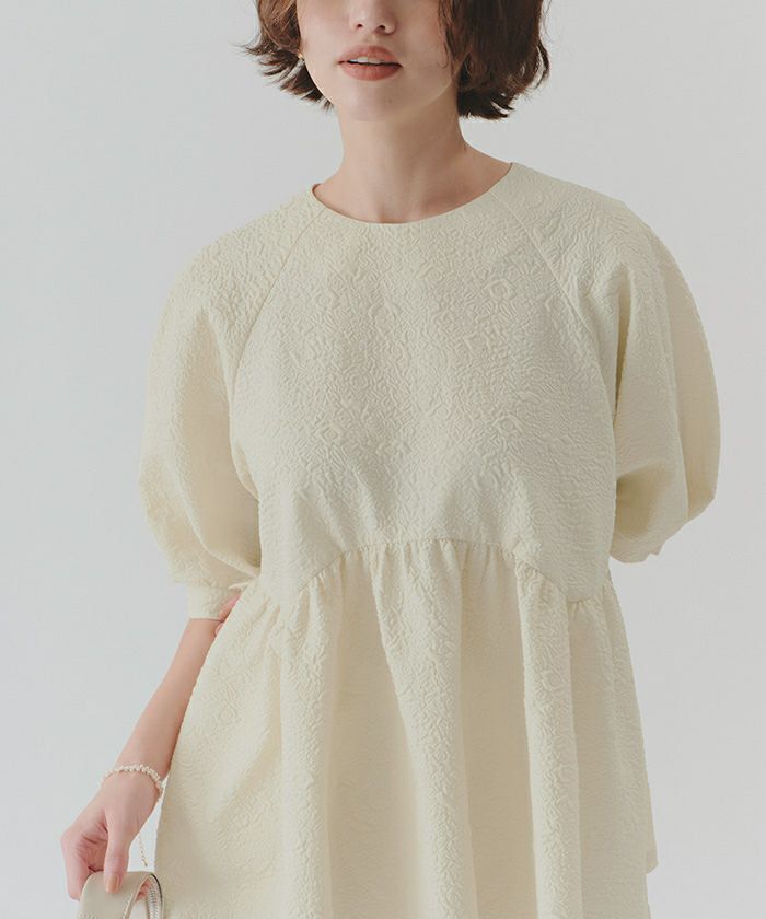 ・ふくれジャガード生地で仕上げた、パフスリーブと身頃のペプラムでメリハリのあるシルエットか完成する襟付きブラウス。