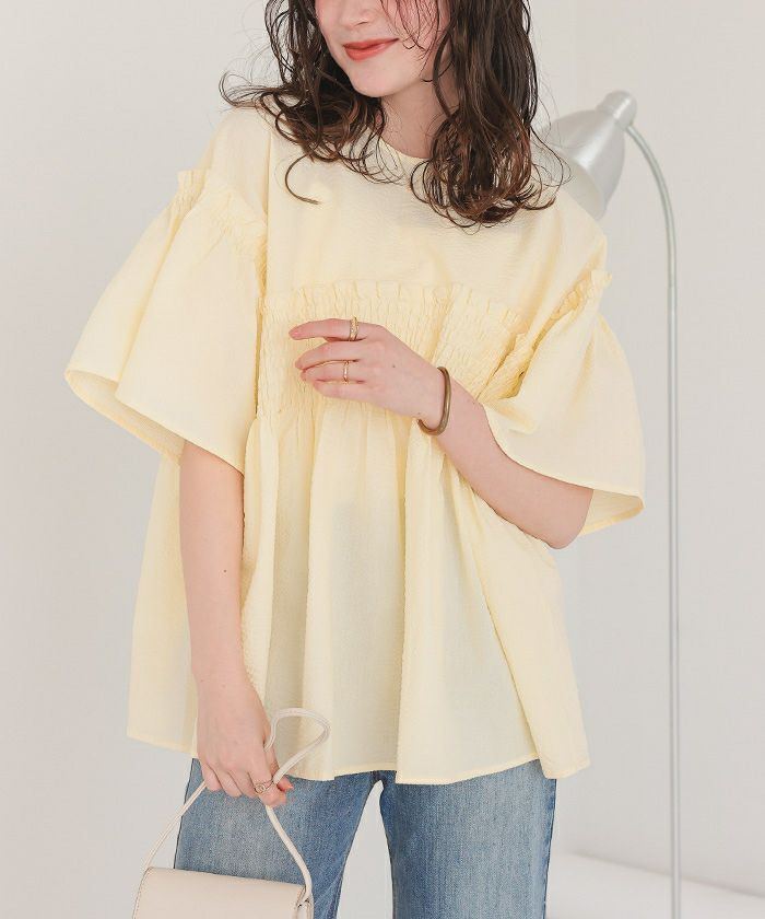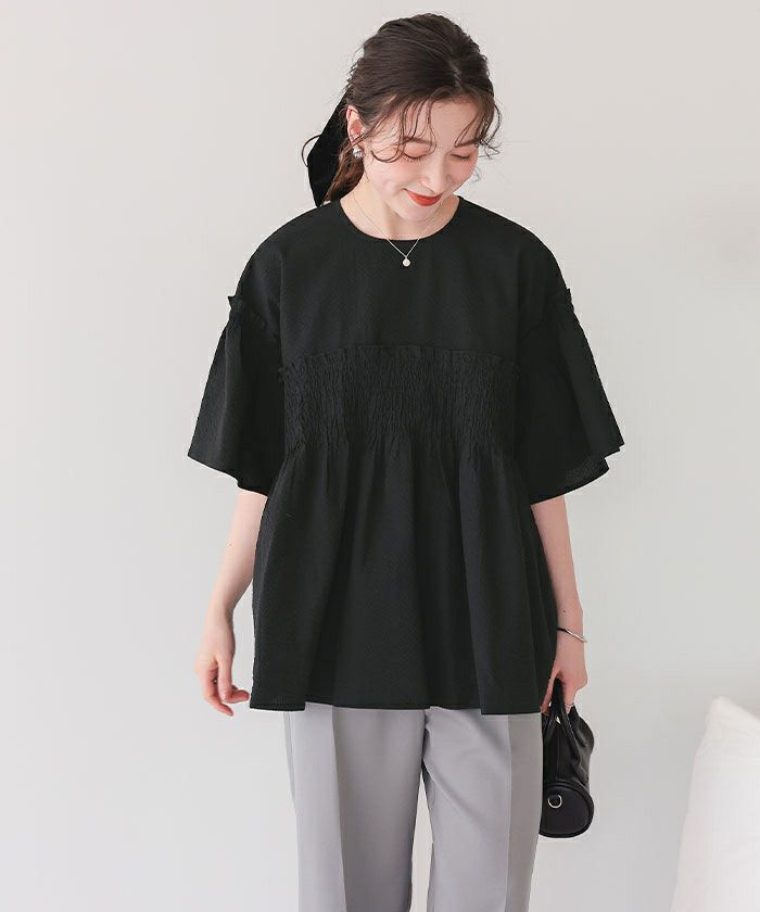 ・表情のあるふくれサッカー素材のお洒落なブラウス。