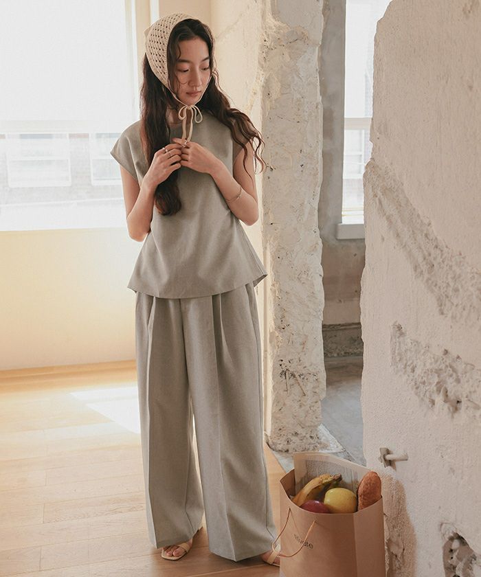 リネン素材のセットアップを探していて購入! シンプルなのにトップスの後ろが空いているのが可愛い♡