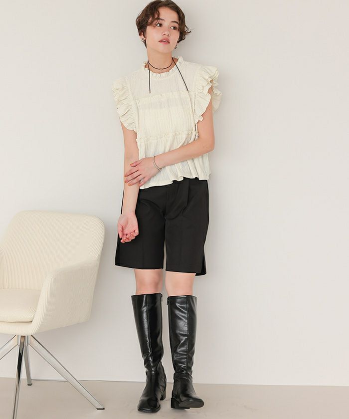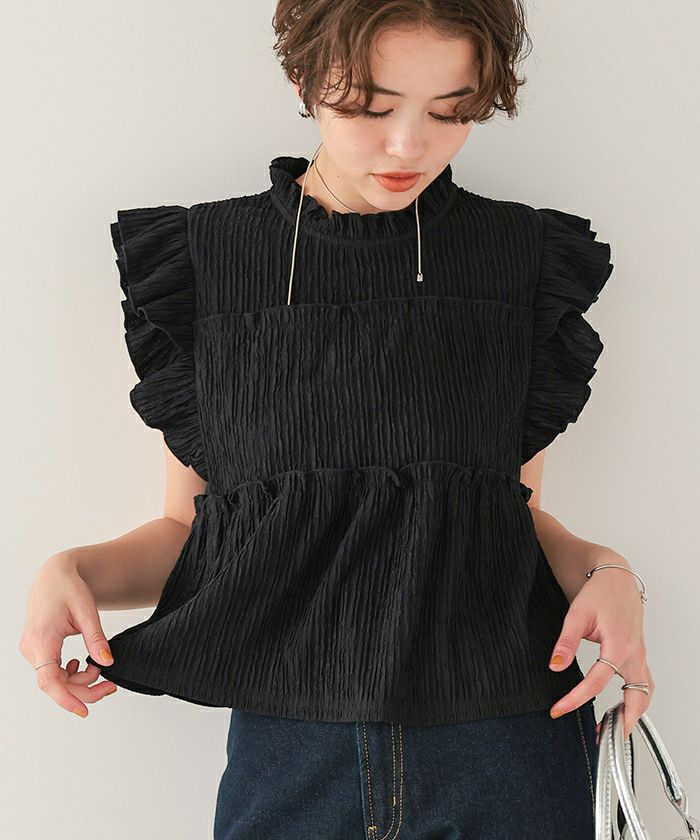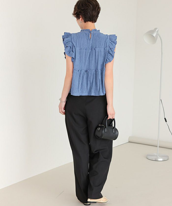 肩のフリルが二の腕を隠してくれるので、体型カバーになります。シワにならない生地ですが、真夏は少し暑いかなと思います。