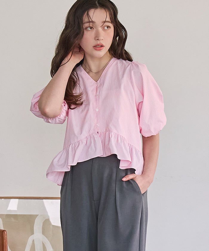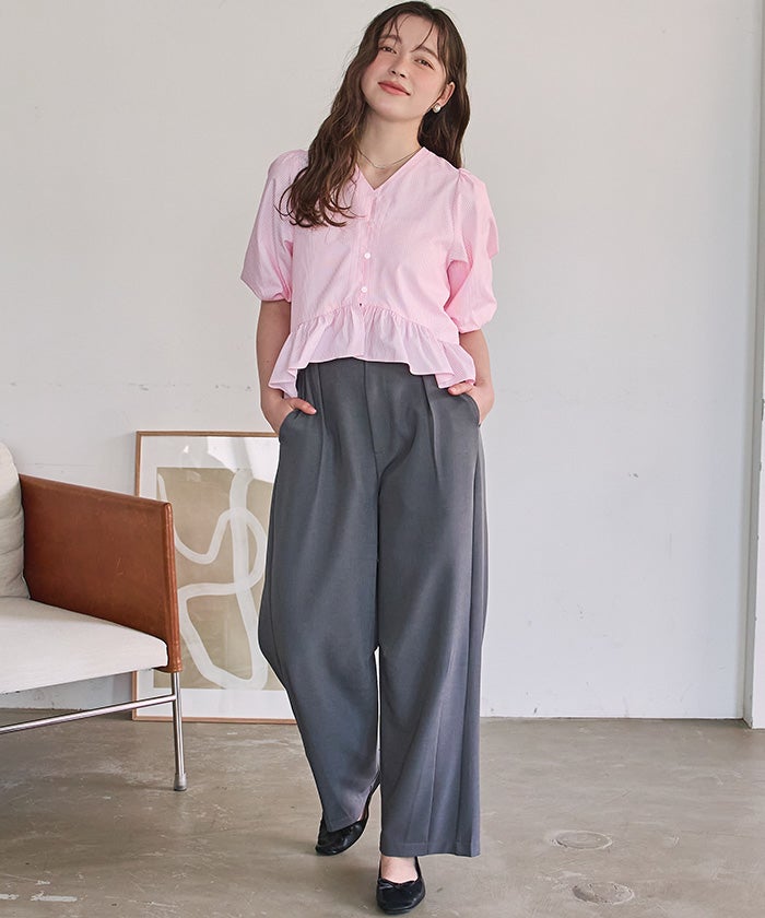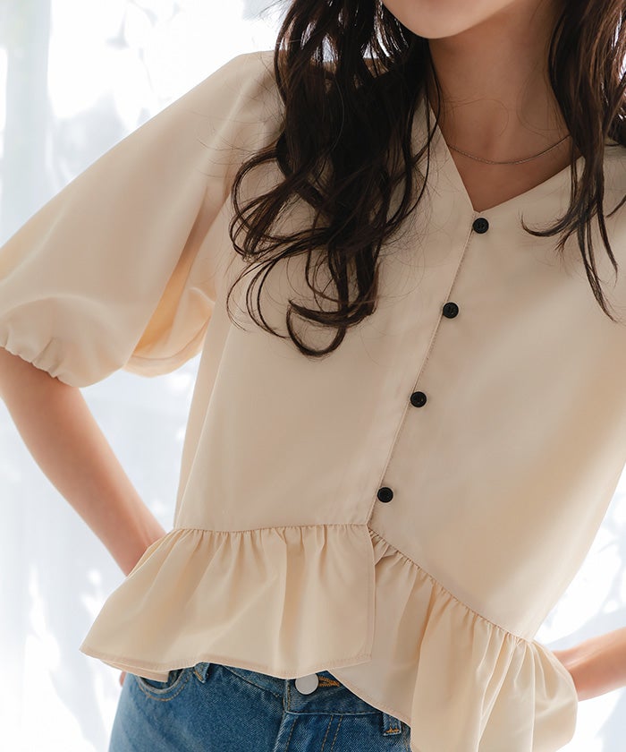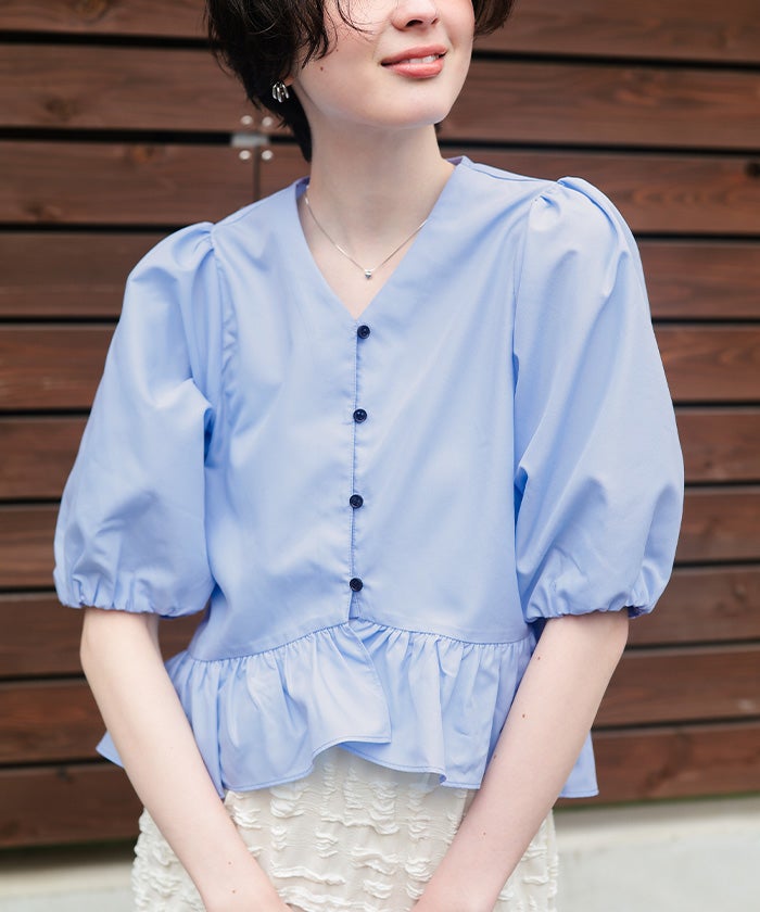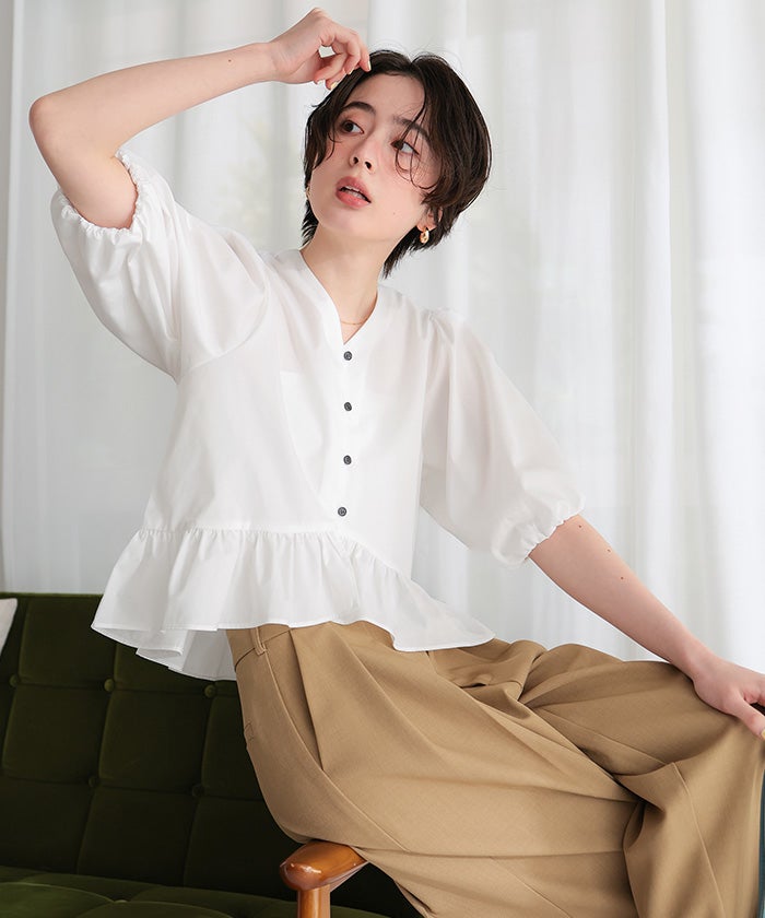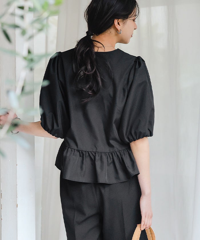 ペプラムギャザーパフスリーブブラウス【メール便可/100】