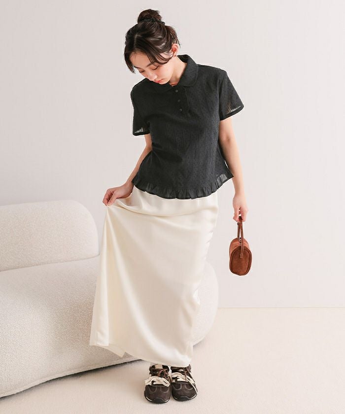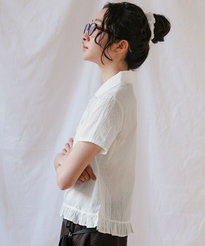 ・丸襟デザインと裾フリルが目を惹く、シュシュ付きブラウス
