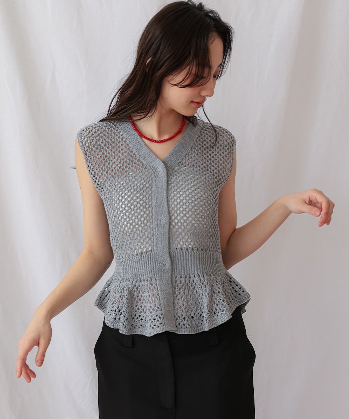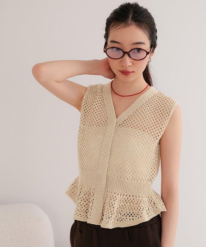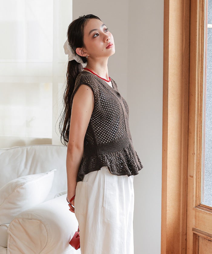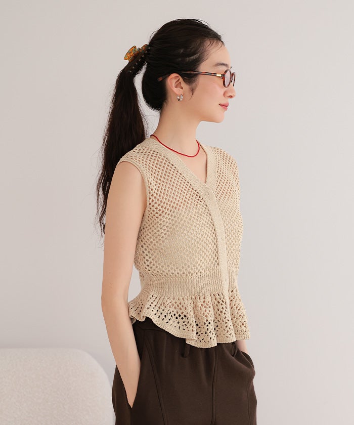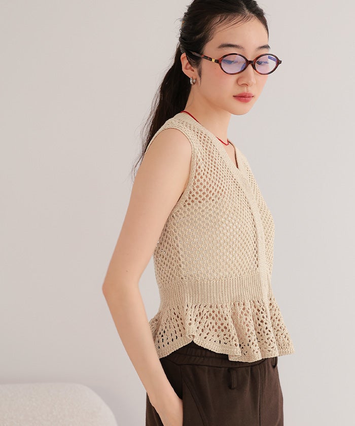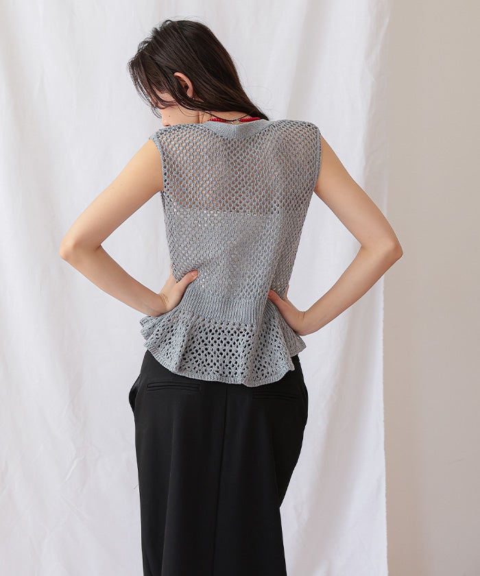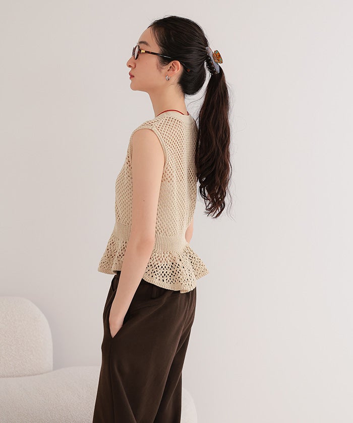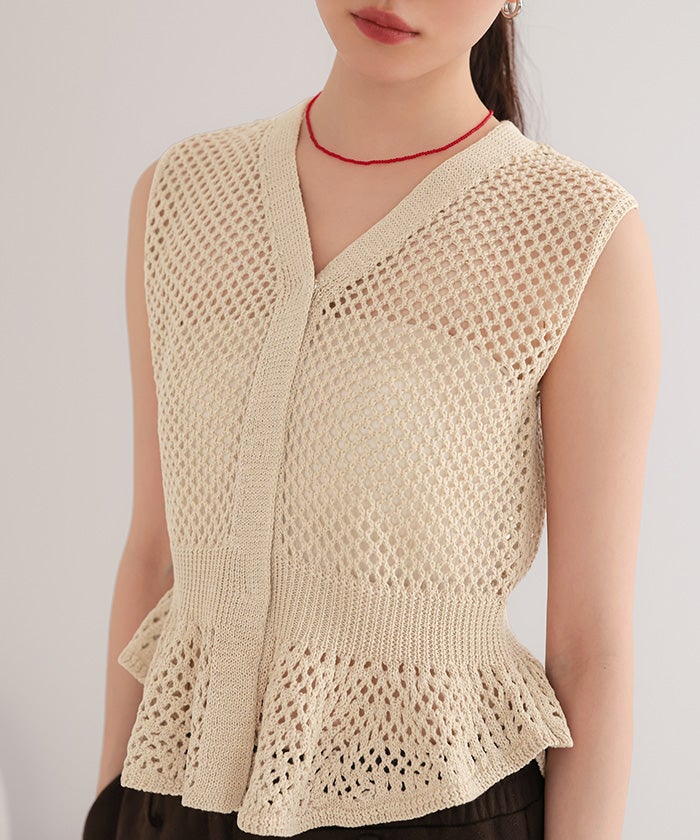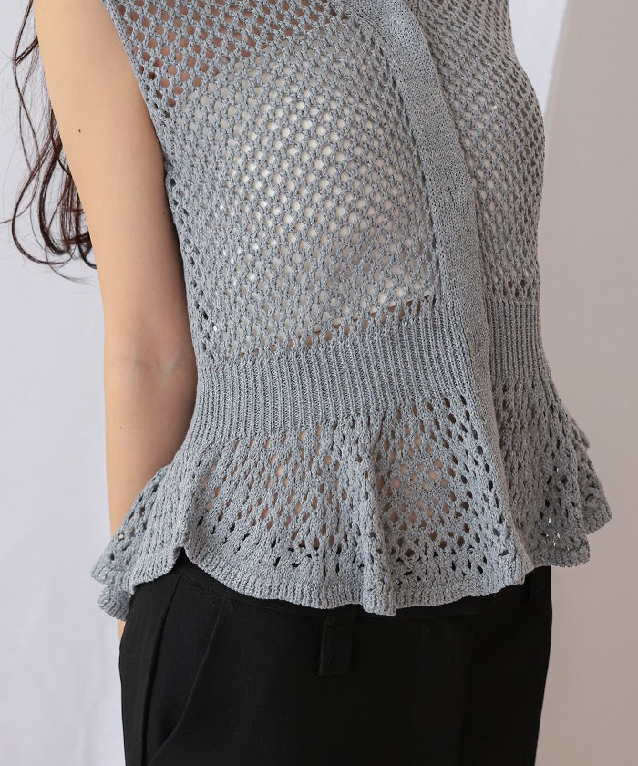 ・透かし編みが涼しげな印象を与える、ノースリーブのペプラムニット