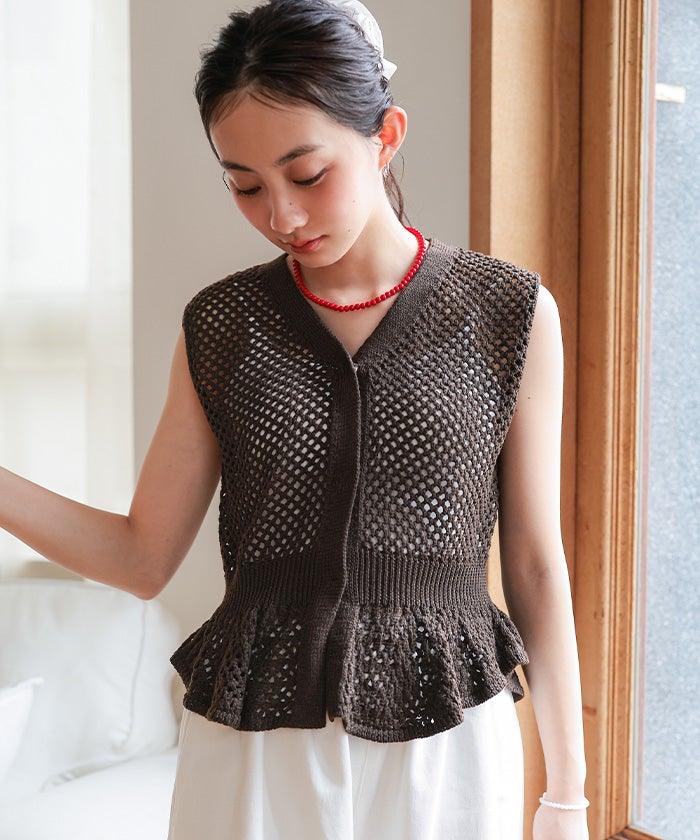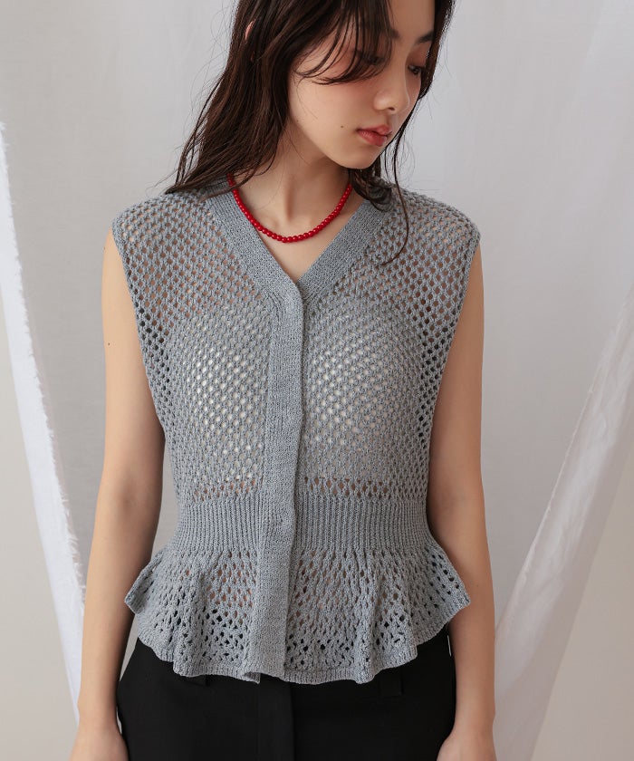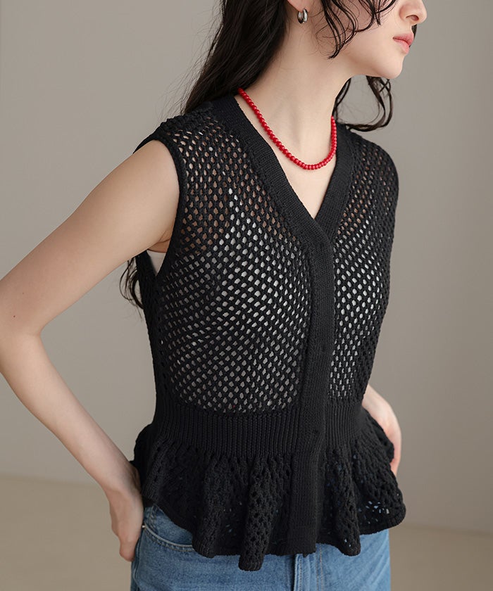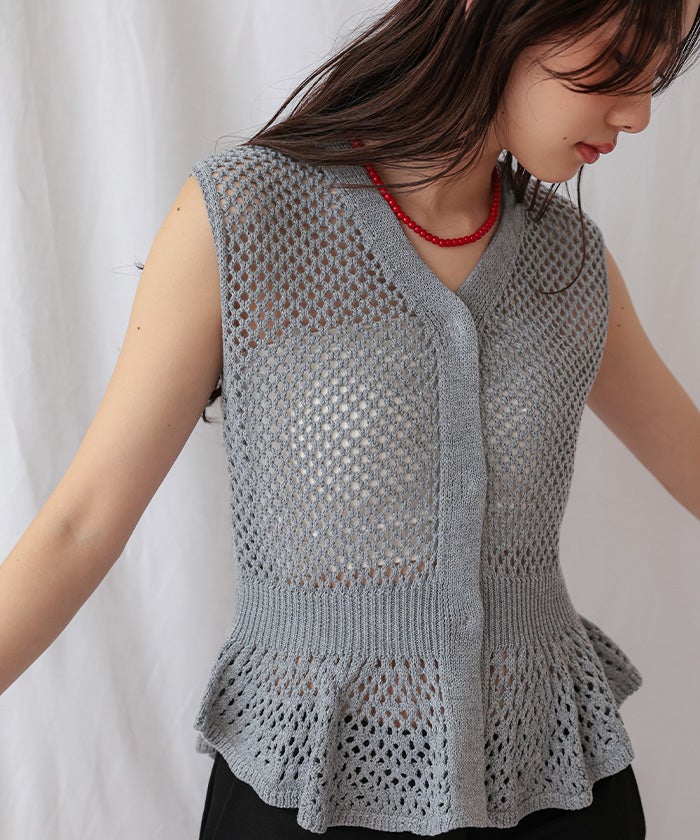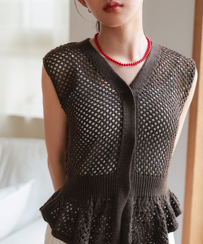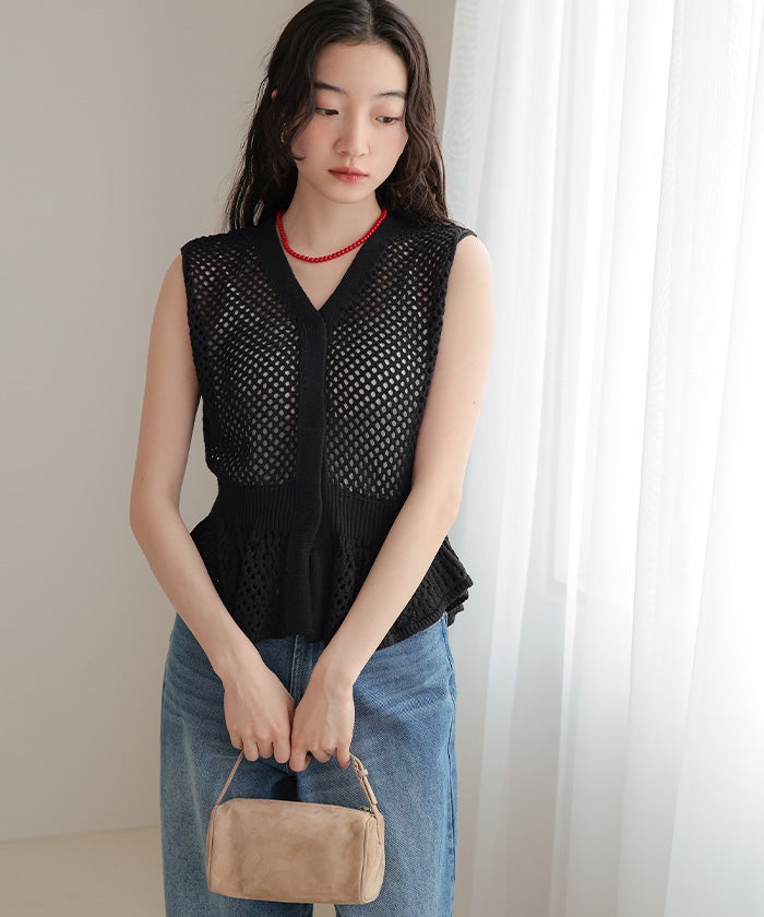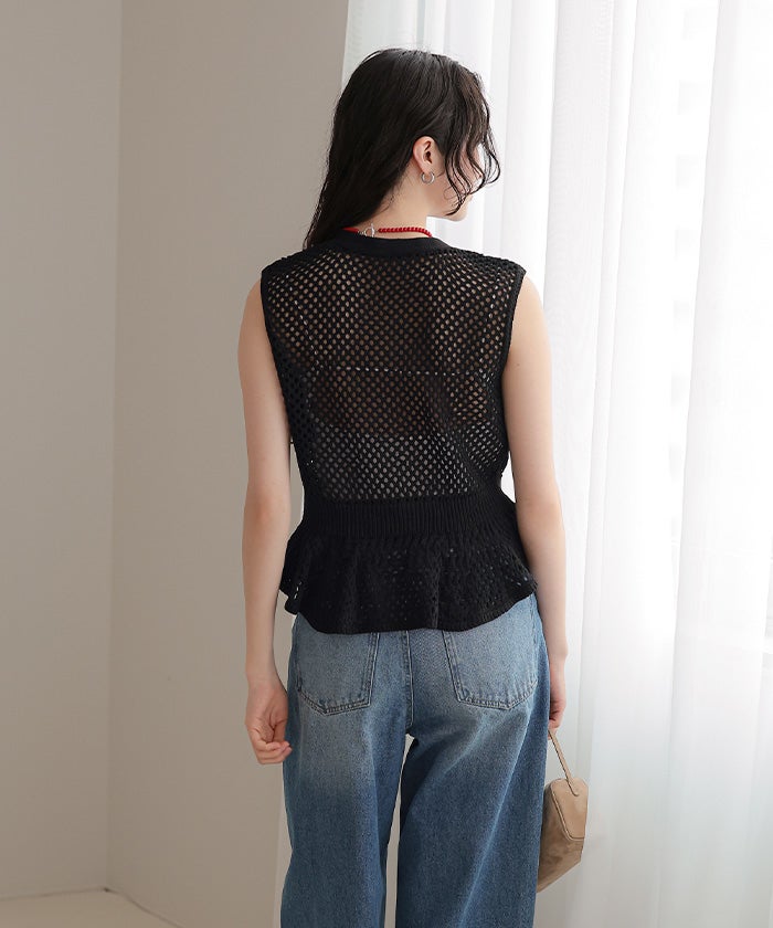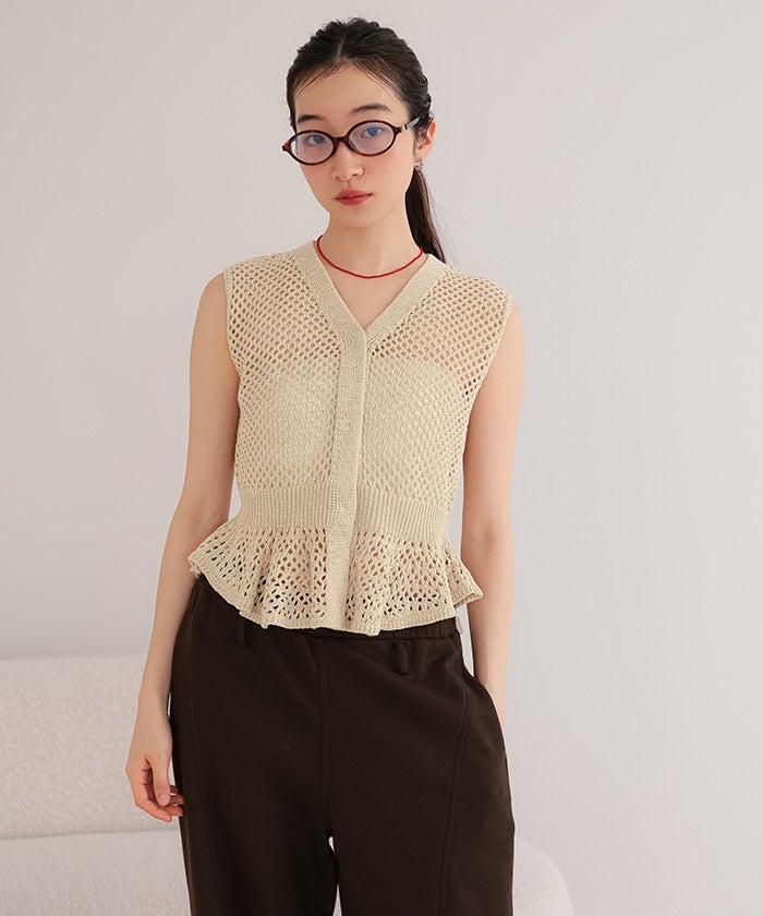 ・透かし編みが涼しげな印象を与える、ノースリーブのペプラムニット