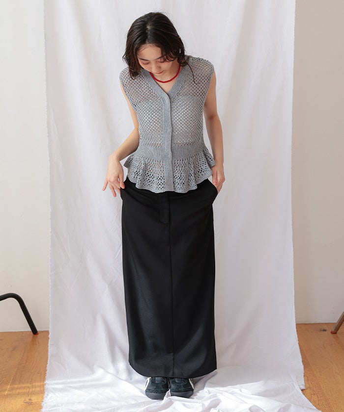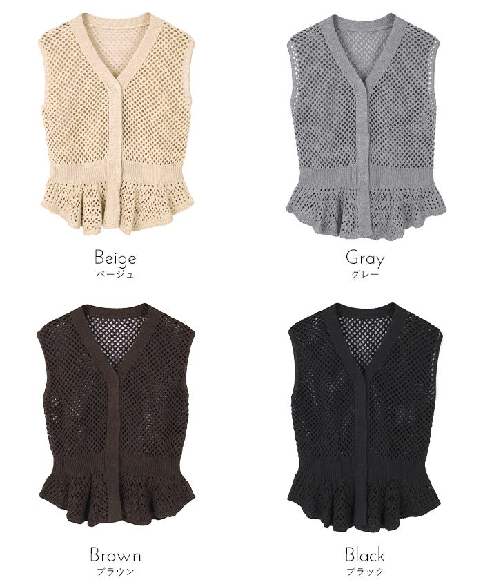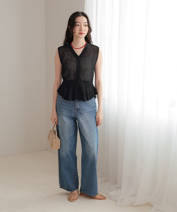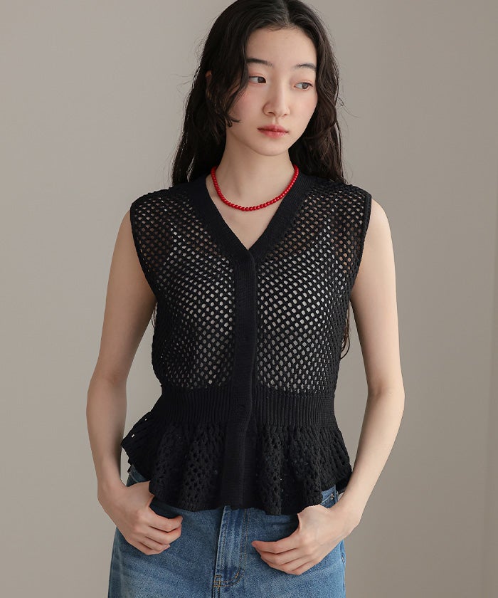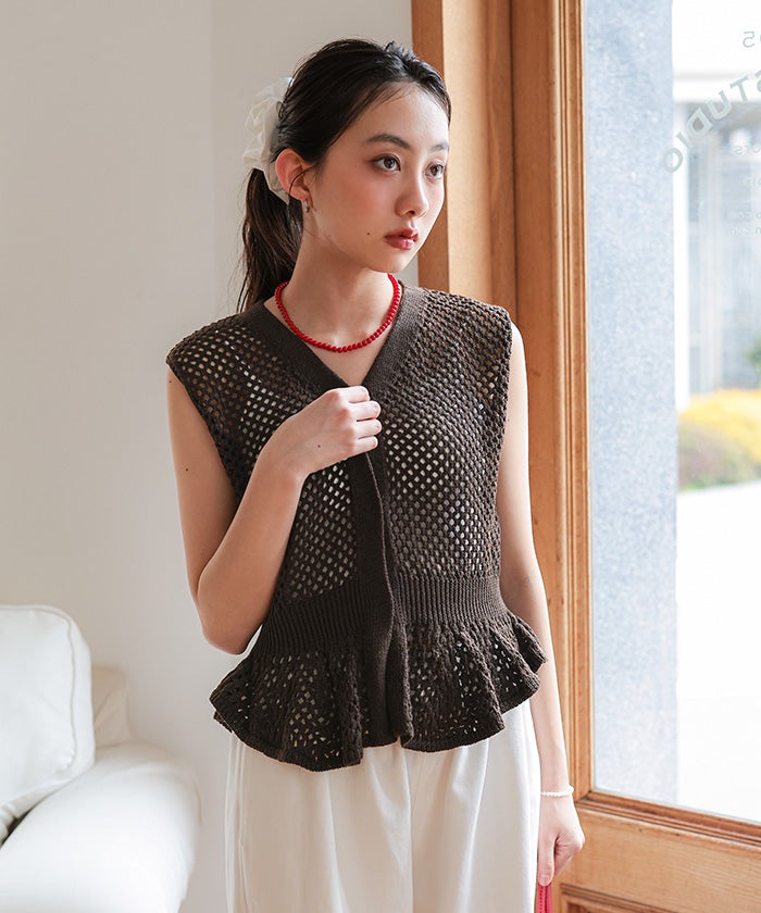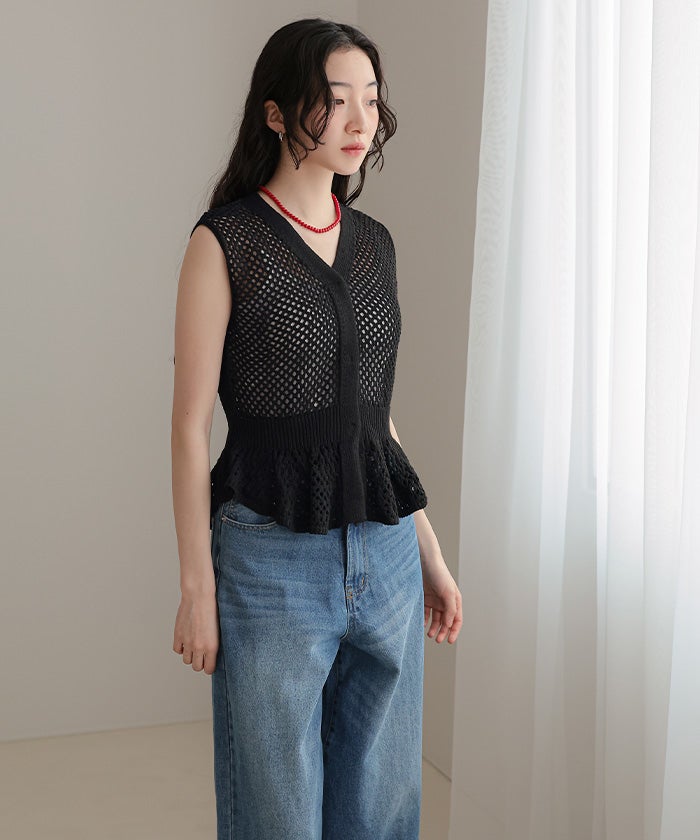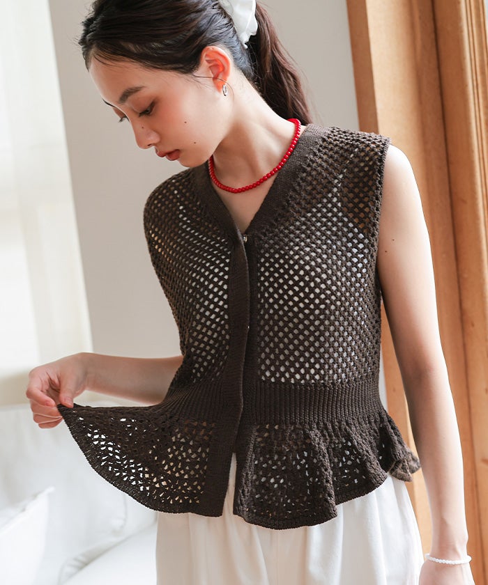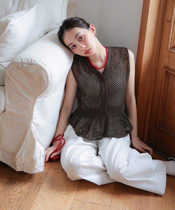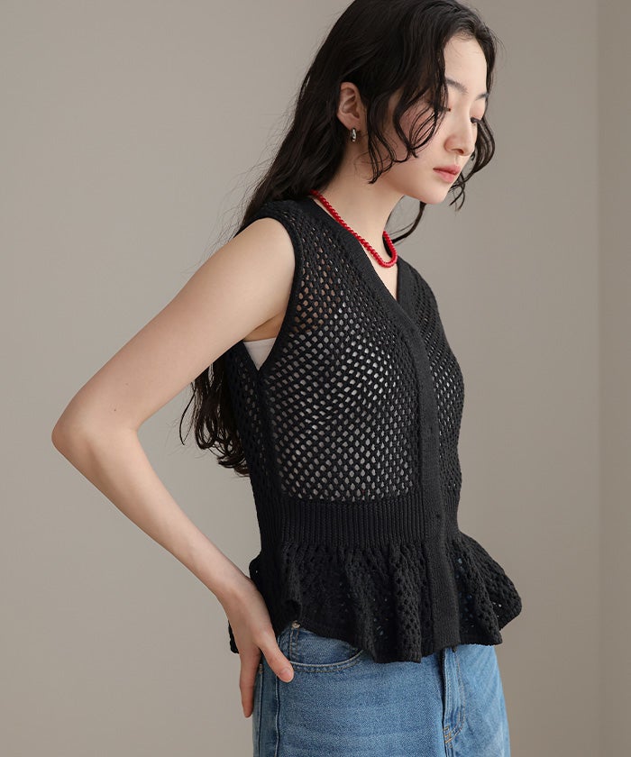 ・透かし編みが涼しげな印象を与える、ノースリーブのペプラムニット