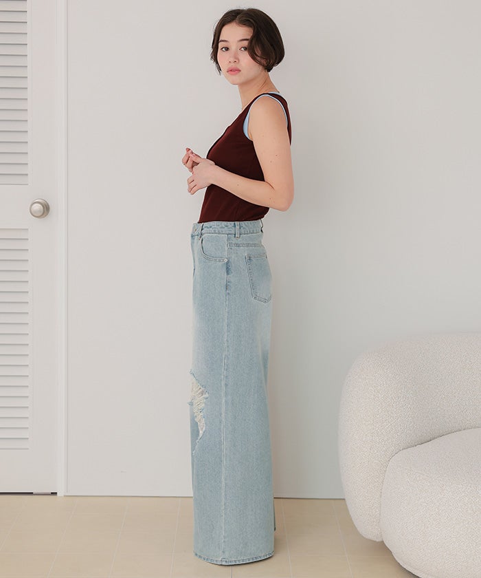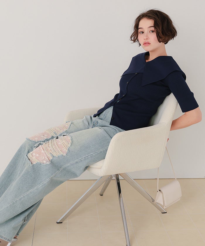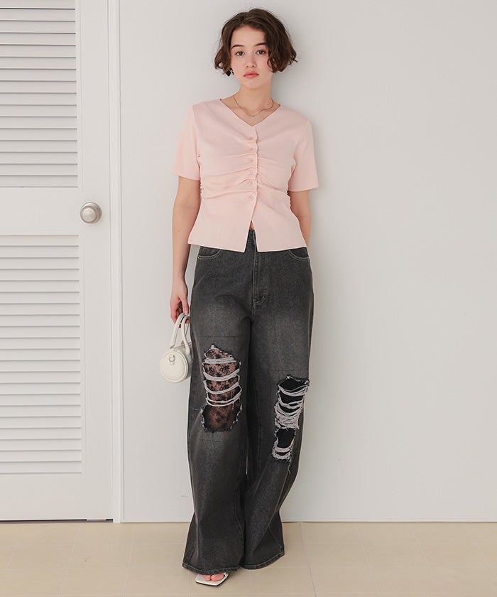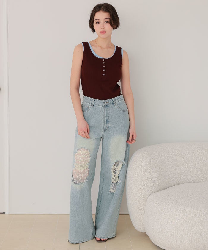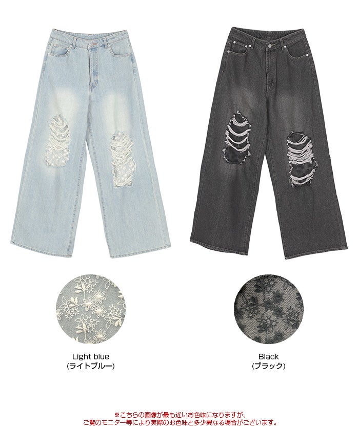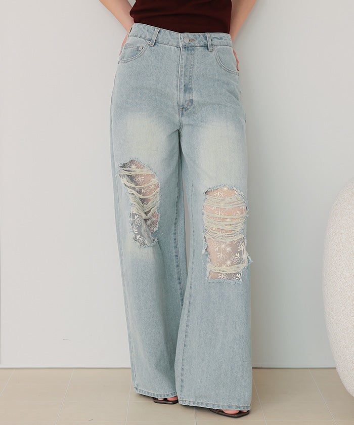 【新作★期間限定20%OFF★10日11時カラ】【titivate】 レース付きダメージワイドパンツ