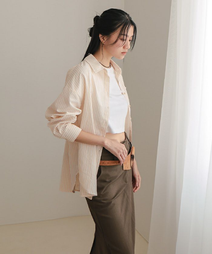 ・シャツはゆるめのシルエットで、微配色の濃いめクリアボタンがアクセント