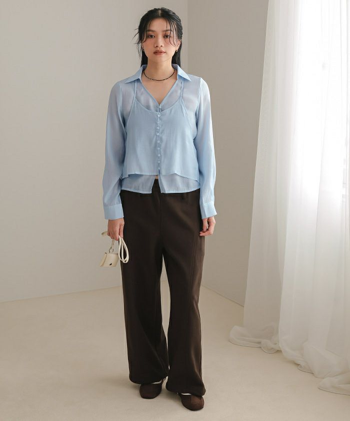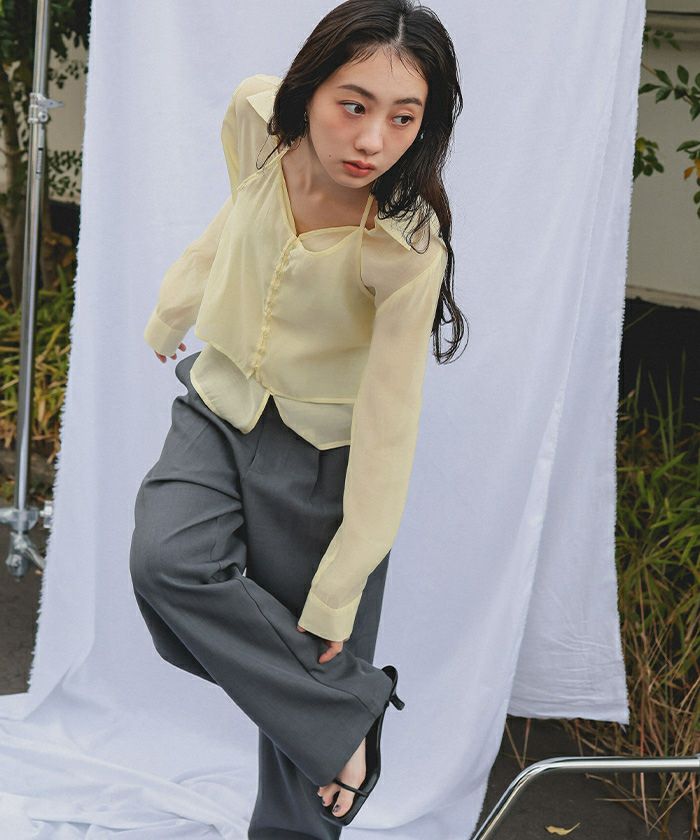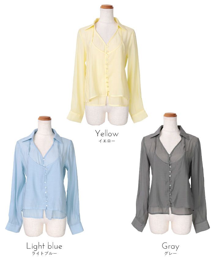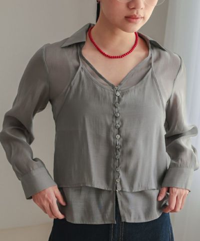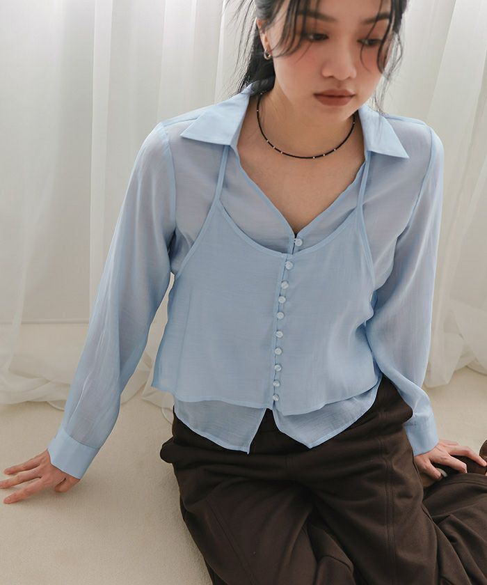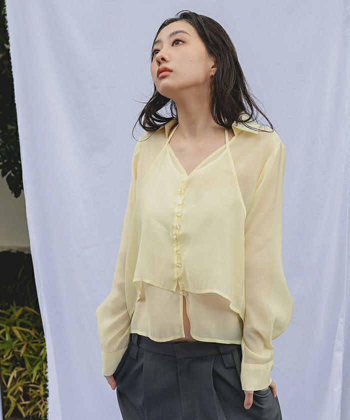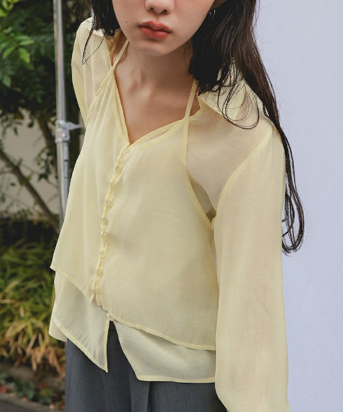 ・ホルターネック型キャミソールとスキッパー衿ブラウスを重ねたシアーホルターネックブラウス