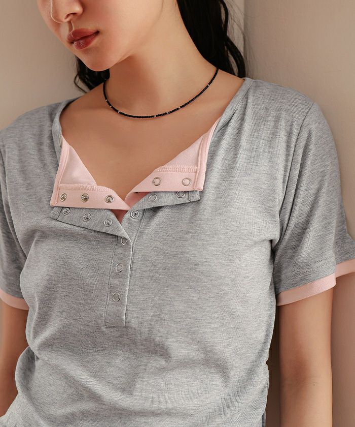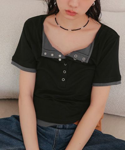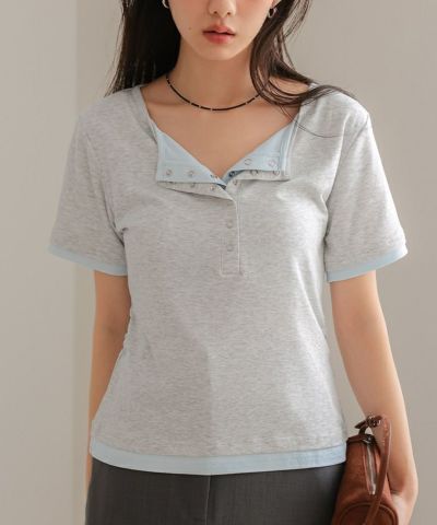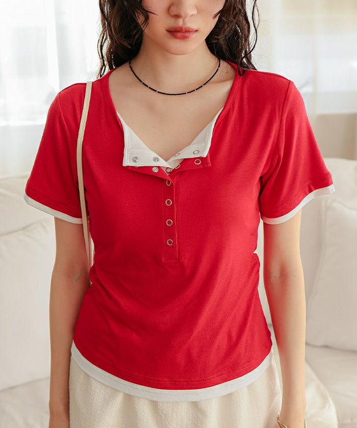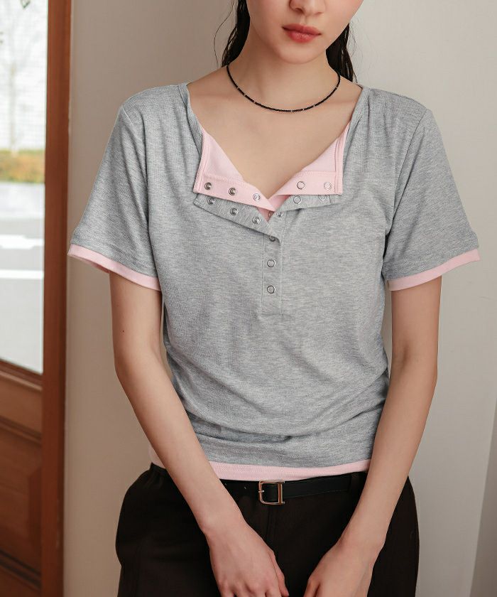 ・レイヤードスタイルを1枚で楽しめる、ヘンリーネックの半袖トップス
