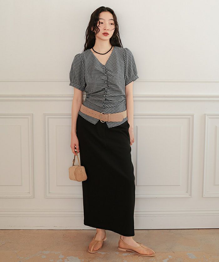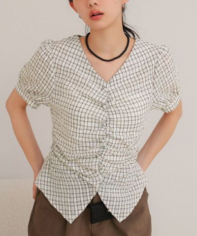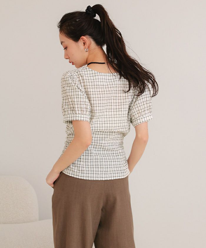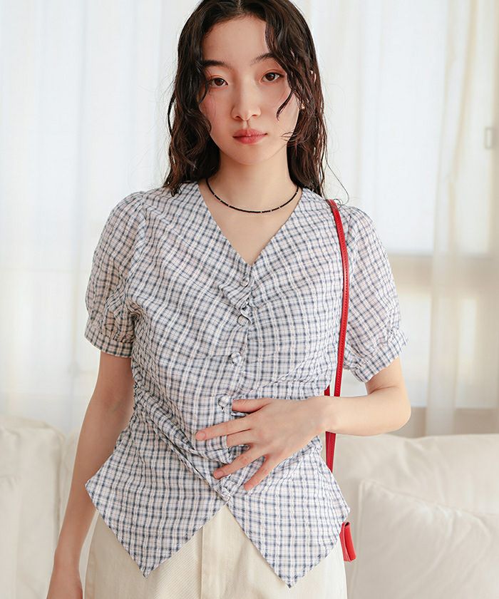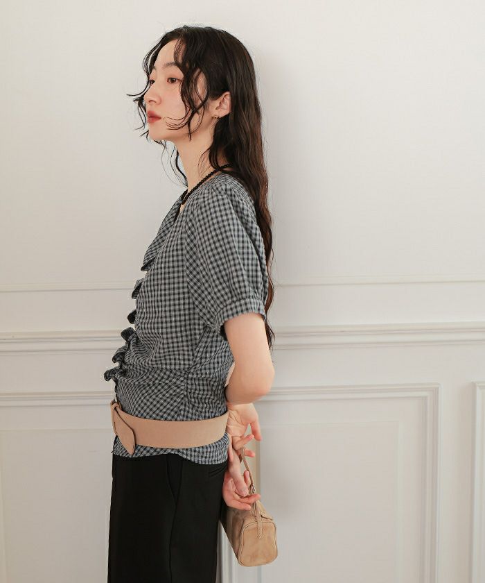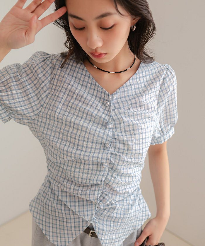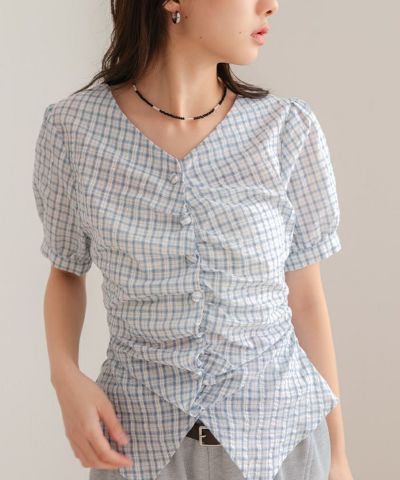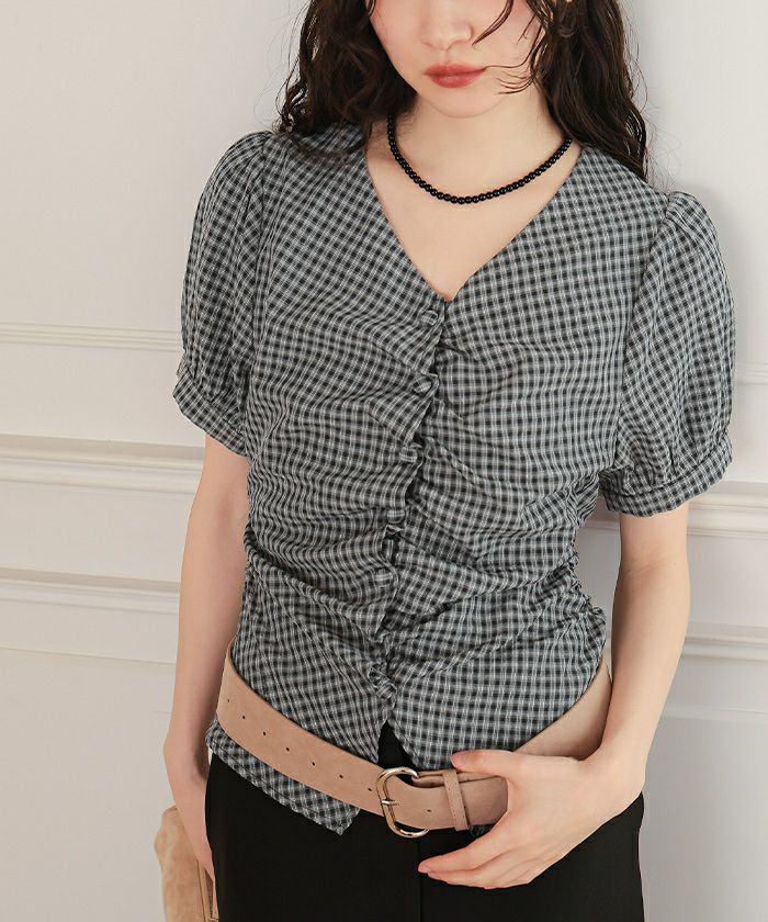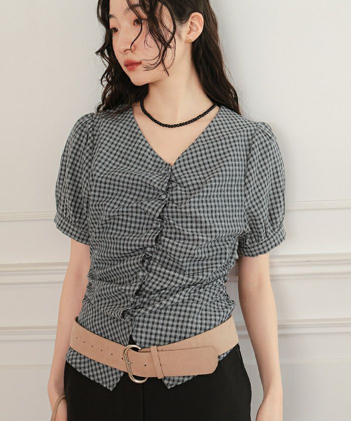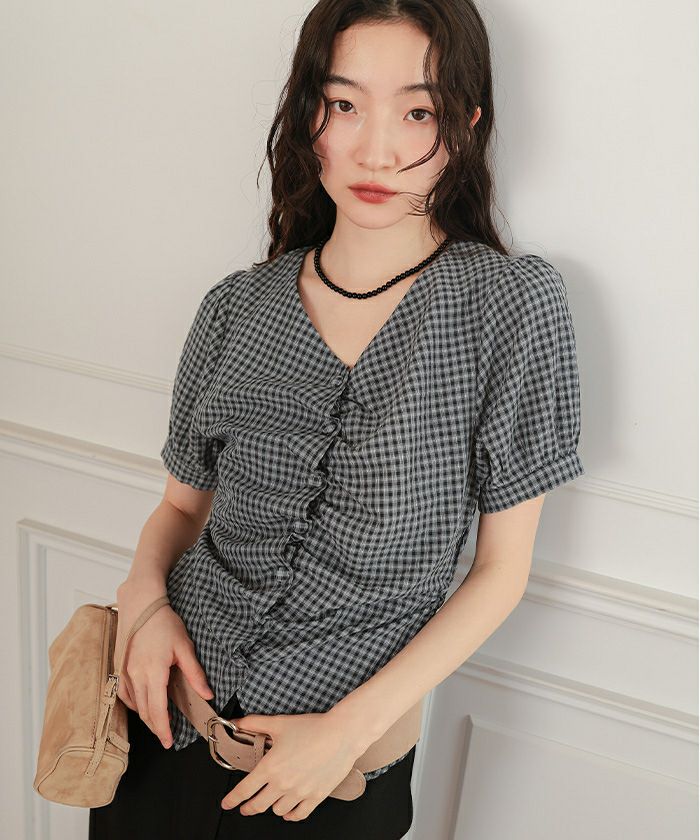 ・フロントに施したギャザーデザインが目を惹く半袖ブラウス