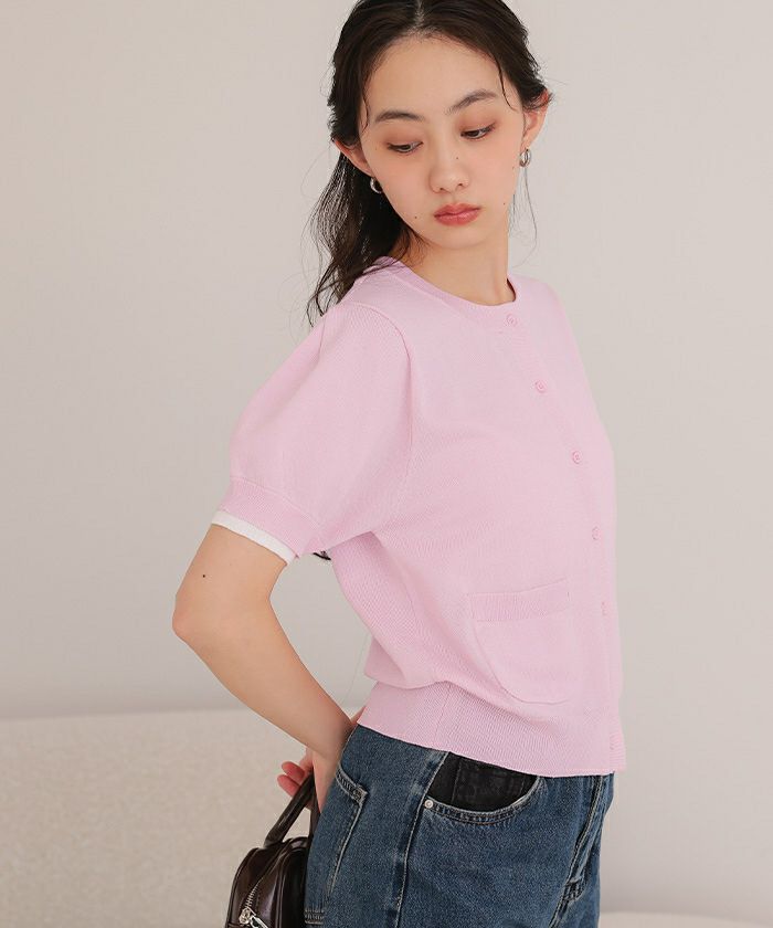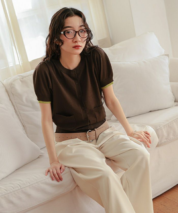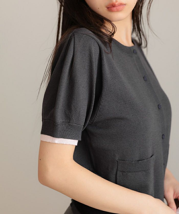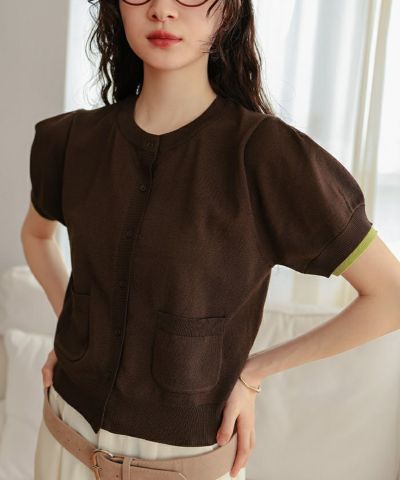 ・袖口の配色がさりげないアクセントになる、サマーニット半袖カーディガン