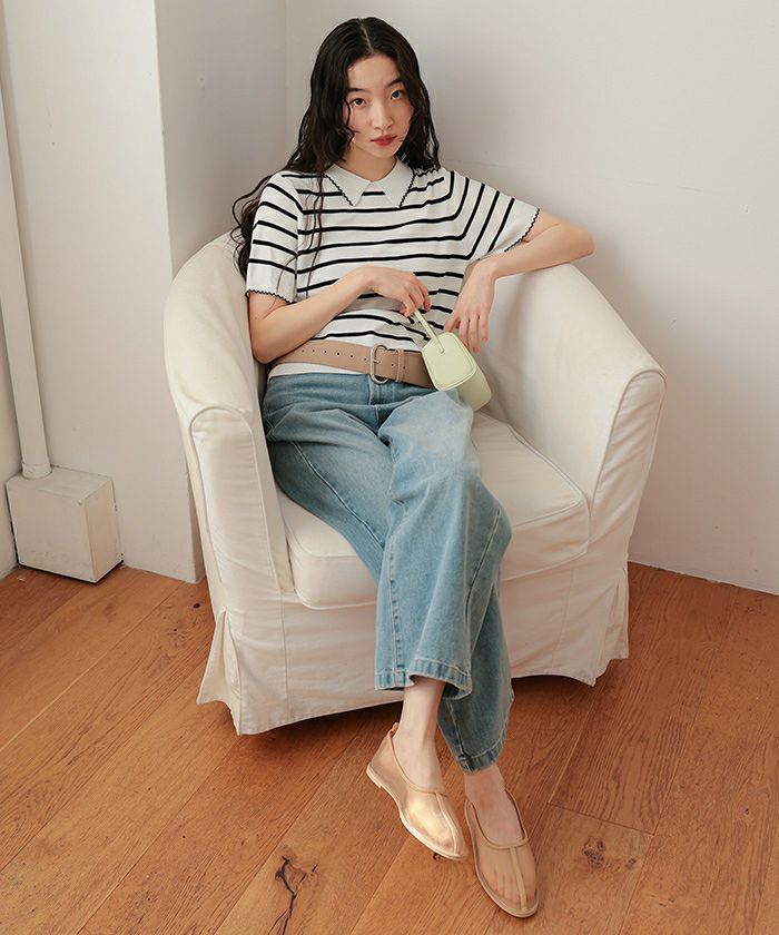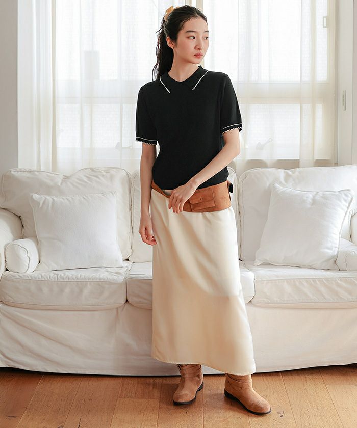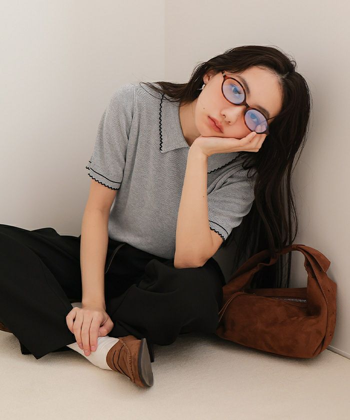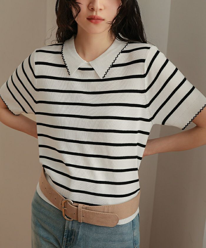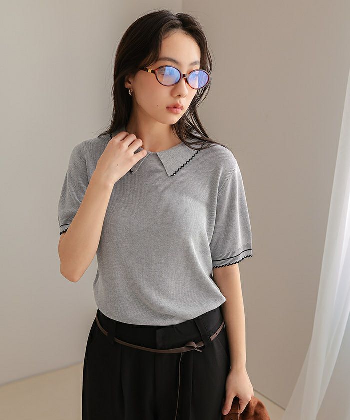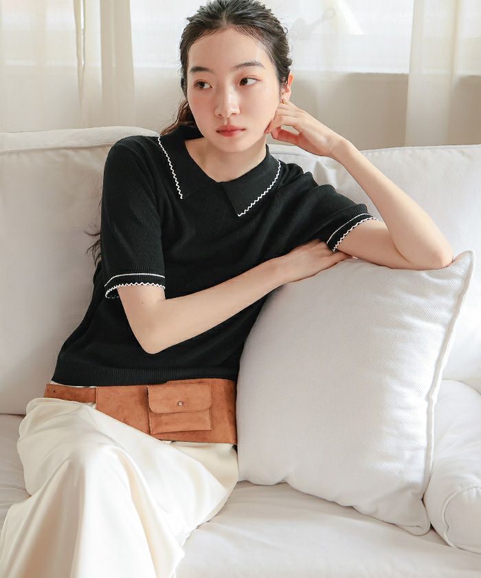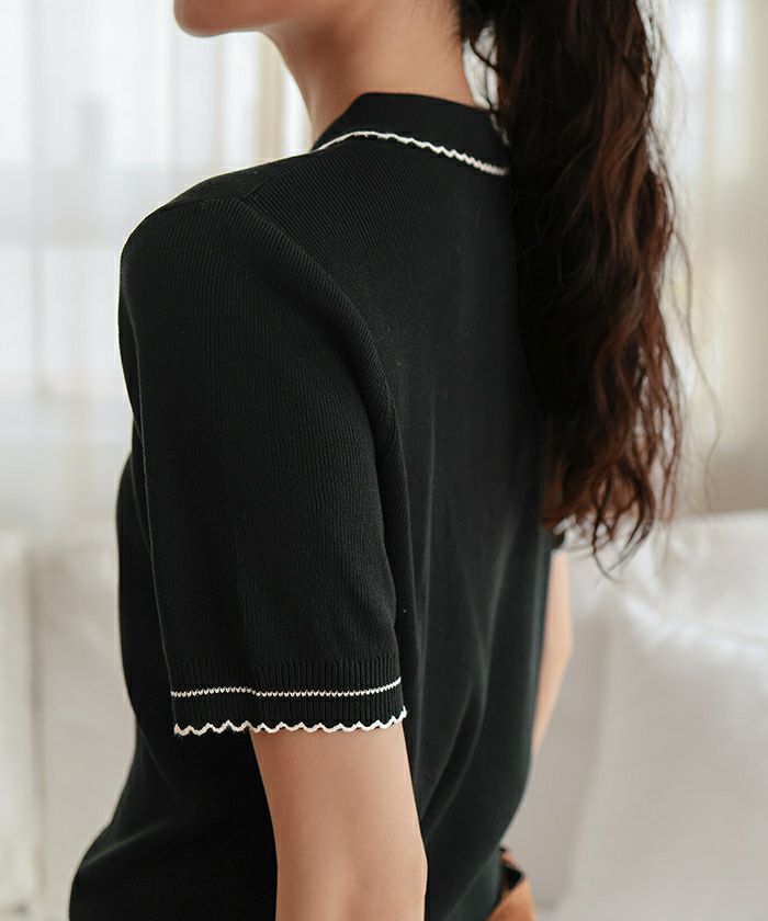 ・襟元と袖口に施したピコデザインがポイントの半袖ポロニット