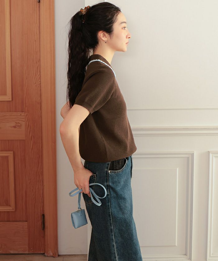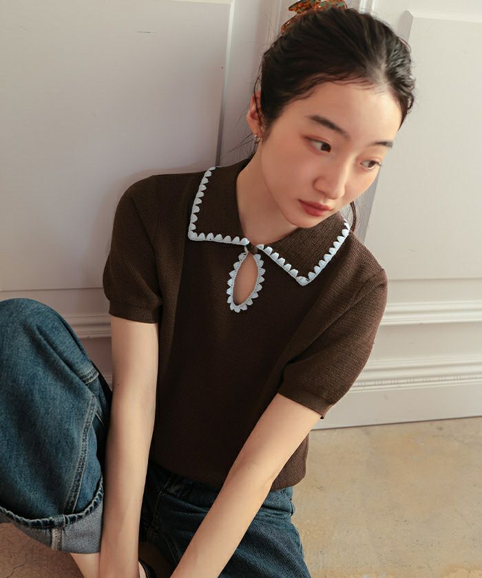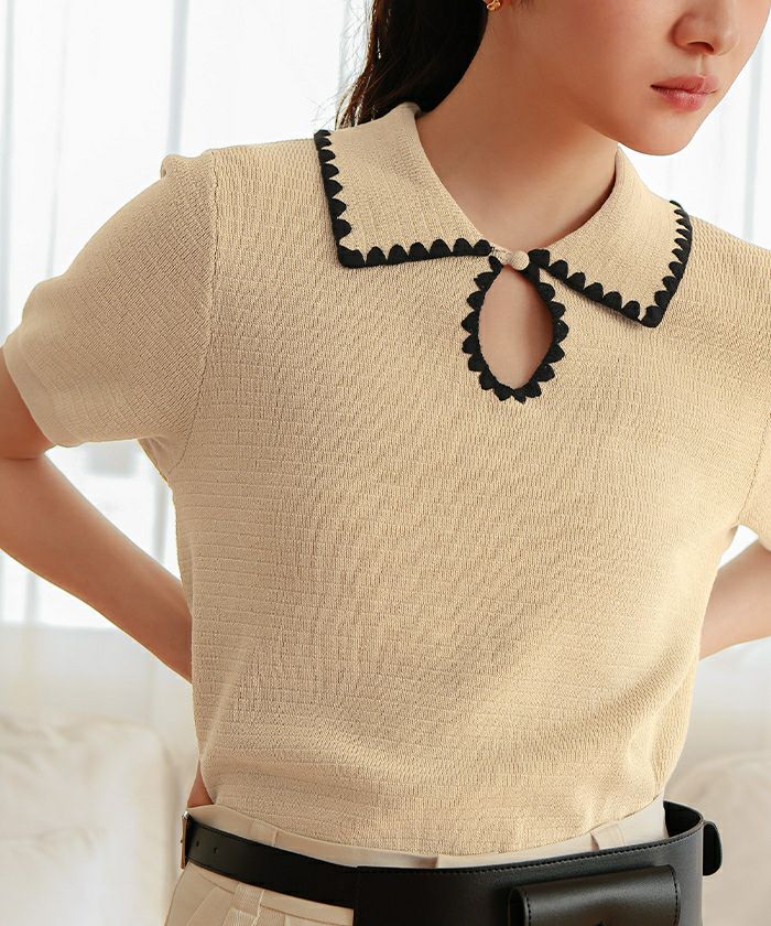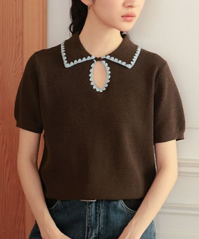 ・配色ステッチが映える、半袖ポロニット