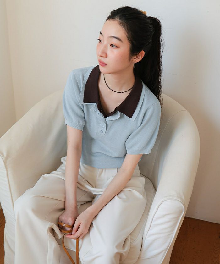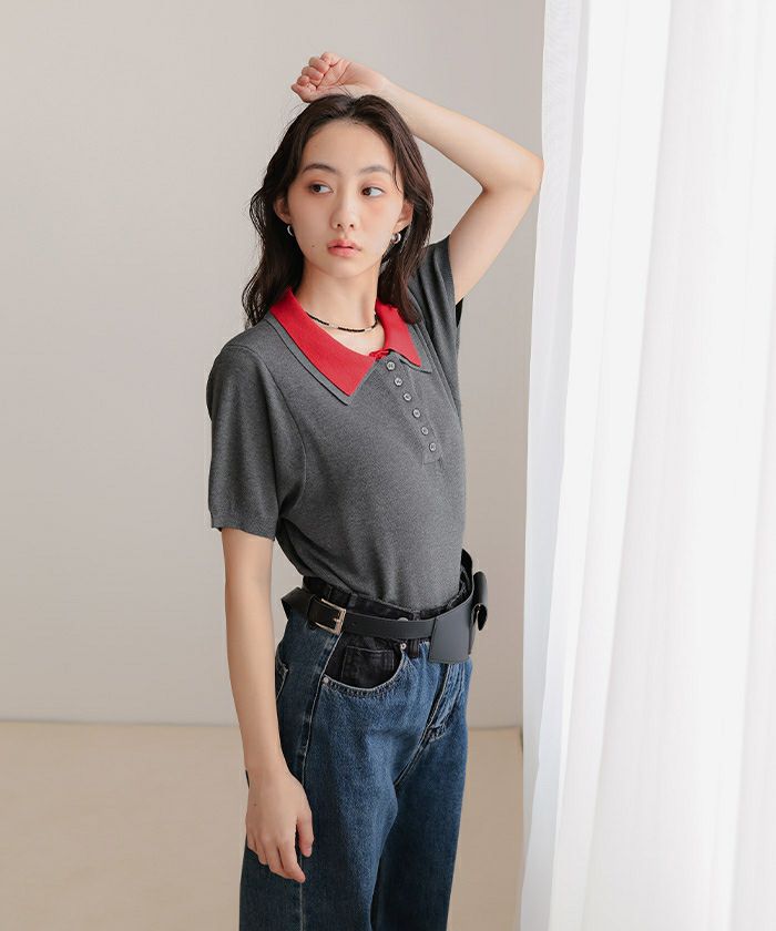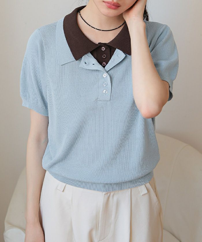 ・配色デザインの襟を重ねたような、レイヤード風デザインが目を惹く半袖ニット