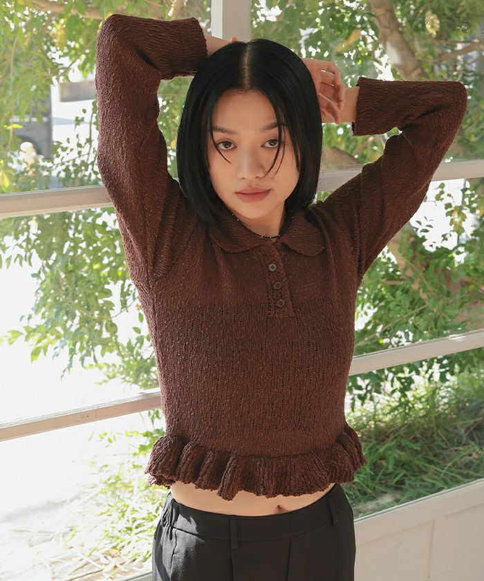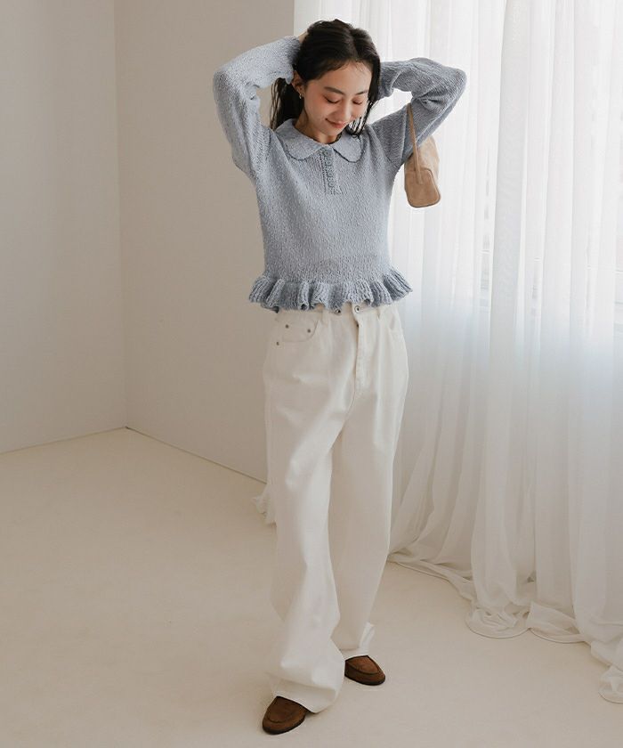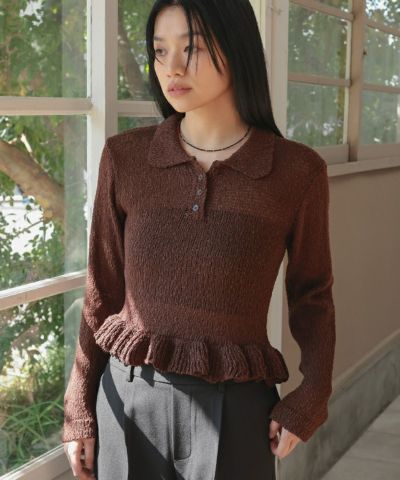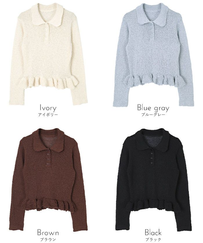 ・トレンドの裾フリルデザインの丸襟ポロニット
