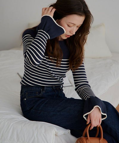 ボーダーだけどネイビーなので、カジュアル嫌いにきれる。袖がふわっと広がっていて女性らしさアップ。