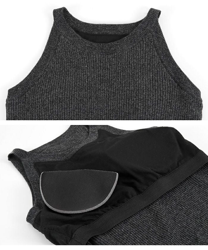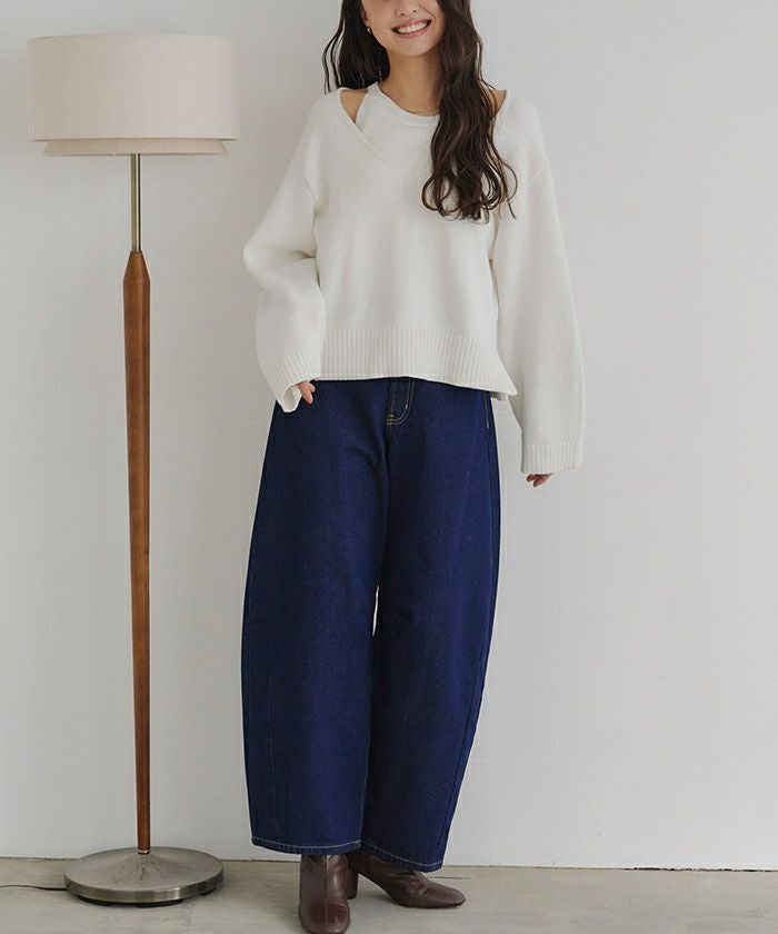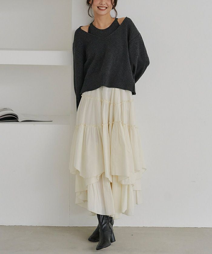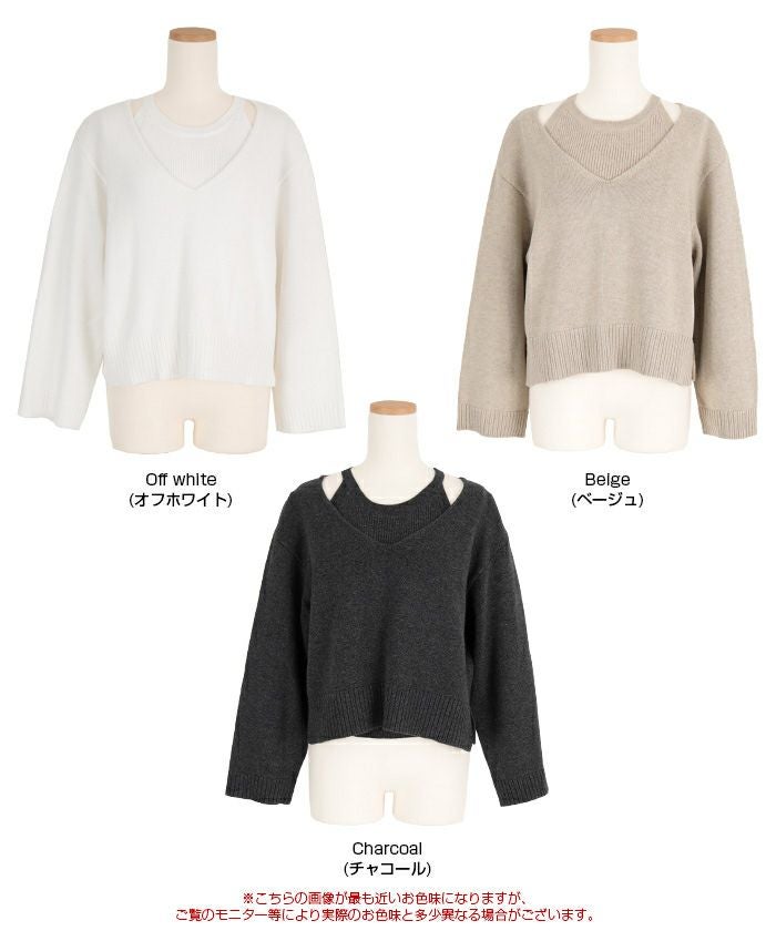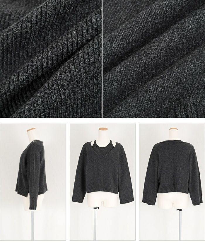 ・インナーのアメリカンスリーブトップスと、Vネックのロングスリーブの同素材ニットアイテムがセット