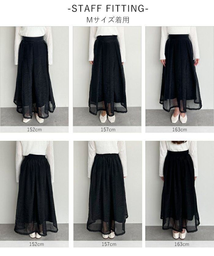 グレージュを購入しました。色味は落ち着いていて、どんなカラーのトップスでもあわせやすそうです。 丈は長いですが、透け感のある素材なので春〜秋まで着れそうです。 背中側のウエスト部分のみがゴムでギャザーがあり、程よくフィットしつつ、お腹側はスッキリしているのも気に入りました。