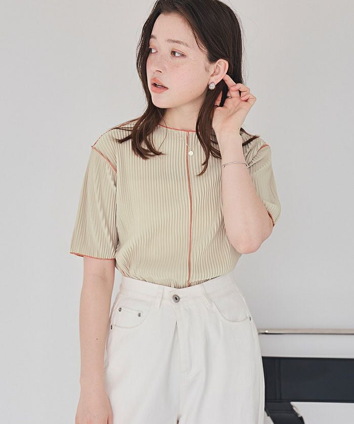 ・軽やかなプリーツ素材に配色メローがアクセントの遊び心があるデザイン。1枚で華やかな印象に