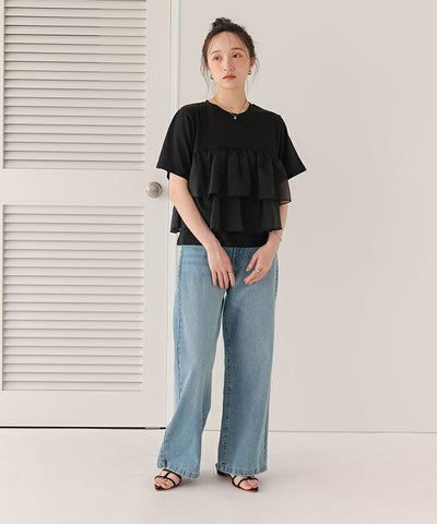 ・カジュアルなTシャツにオーガンジーフリルが目を惹く一着