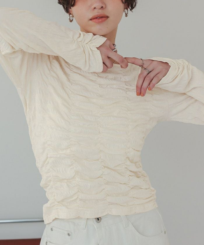 前後の身頃と袖口に施されたシャーリングが目を惹く、これ一枚で着映えするトップスです。 さらっとした生地で着心地も良いです。