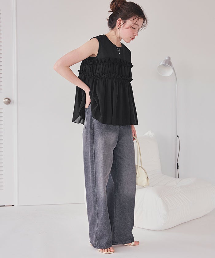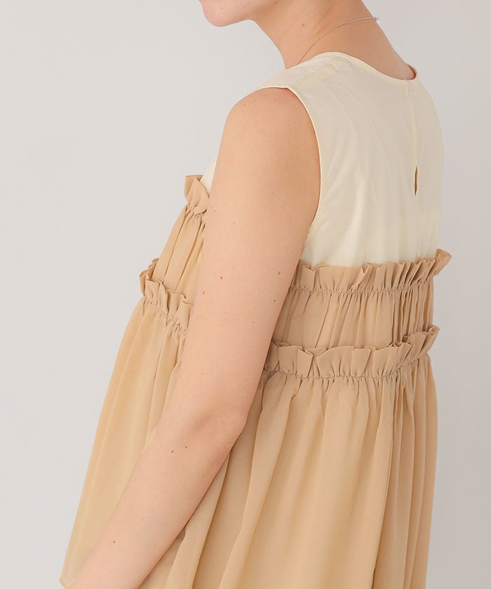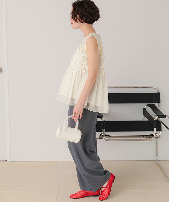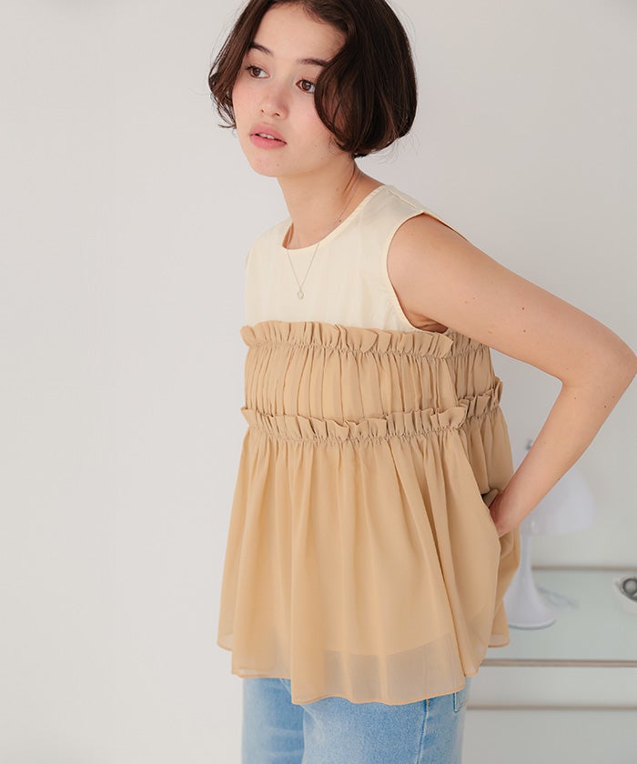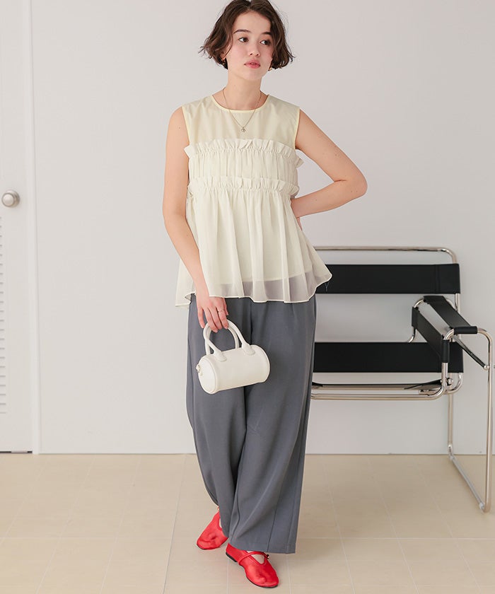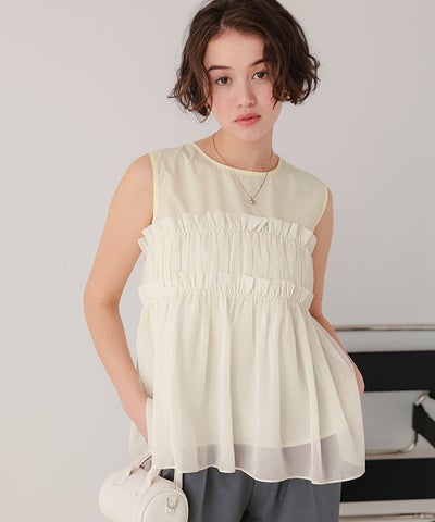 ・たっぷりとギャザーの入った、メリハリのあるシルエットがかわいいノースリーブトップス