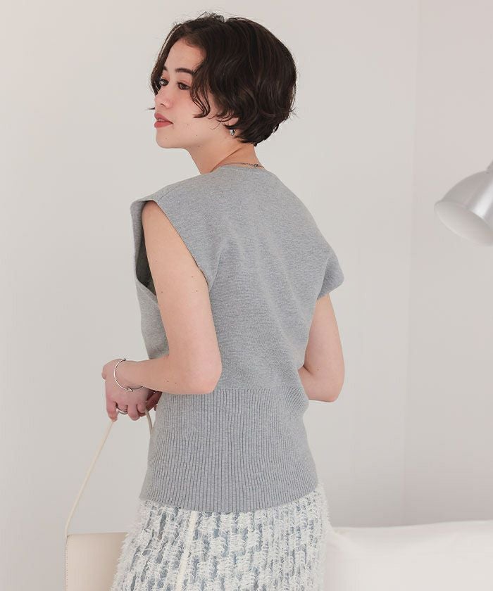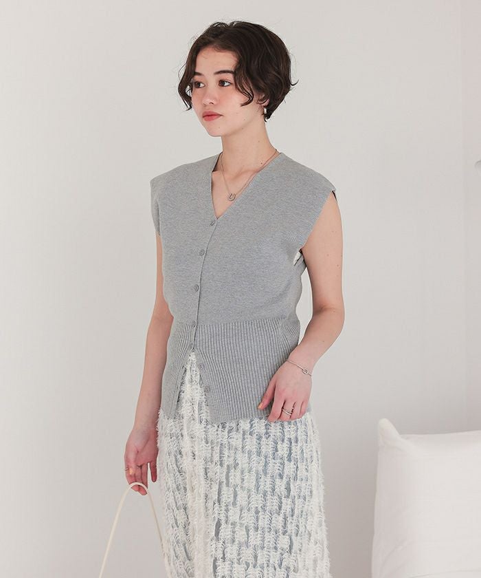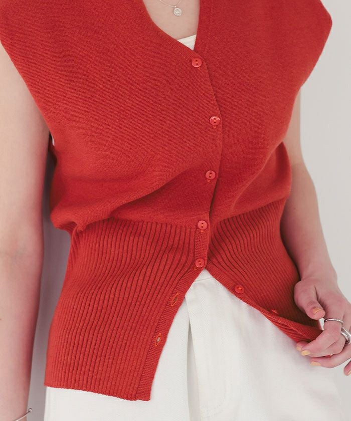・ノースリーブ/Vネックですっきりしたデザインの、前ボタン仕様のニットベストトップス。