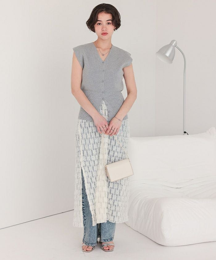 ・ウエストからは編地変化をつけ、裾に向かって絞ったデザインに。裾は釦を開けて少し広げて着こなすのがおすすめです。