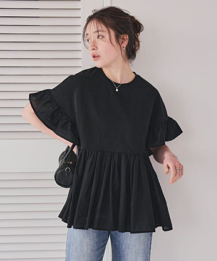 ・ふんわりとギャザーボリュームがかわいい、コットンボイルドッキングのカットソートップス