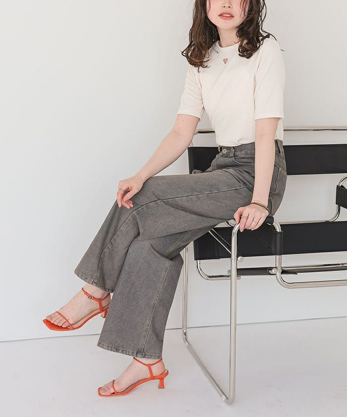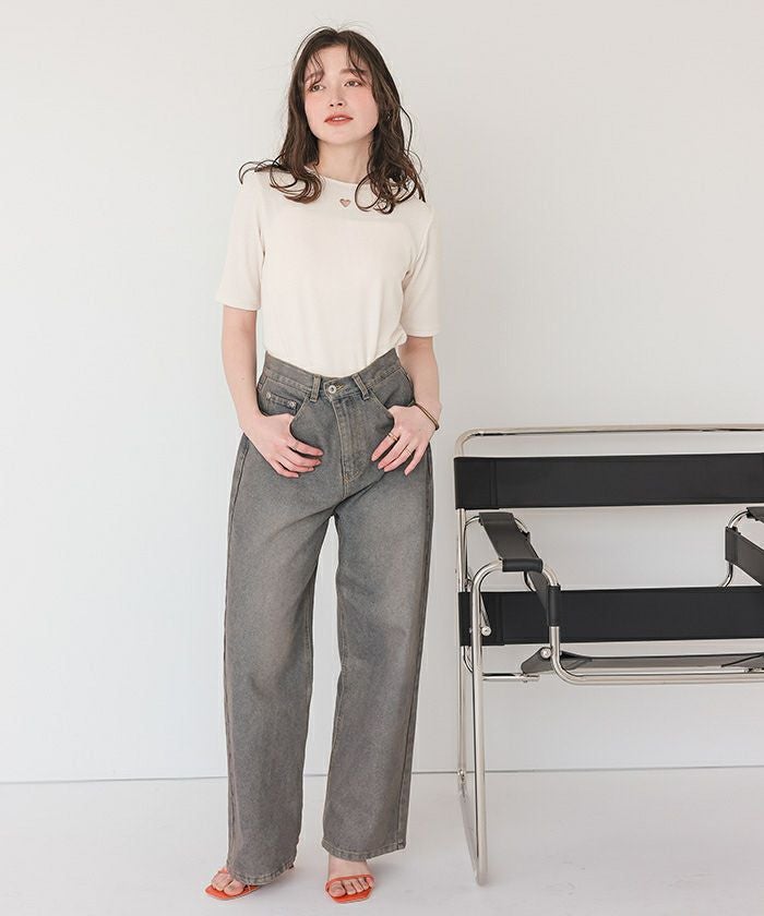 ・シンプルなトップスですが、ハートのワンポイントがトレンド感を演出し、手抜きに見えないスタイリングを叶えます