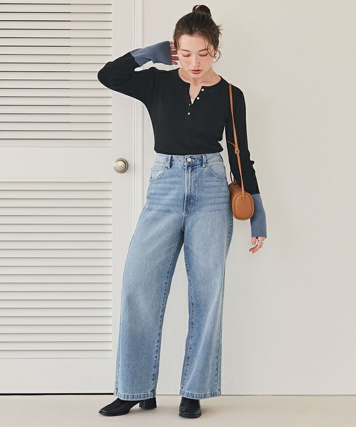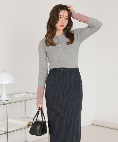 袖配色ヘンリーネックニット