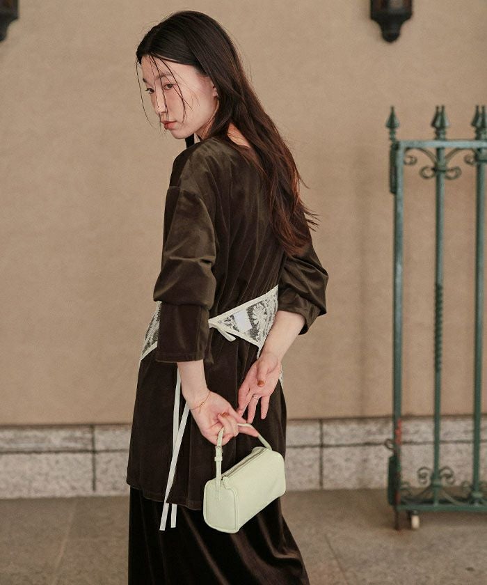 この製品は特有の光沢や風合を持ったベロア素材を使用しております。大変デリケートな性質があり、着用中の摩擦により下着などに毛羽が付着する事がありますが、外観への影響はありません。