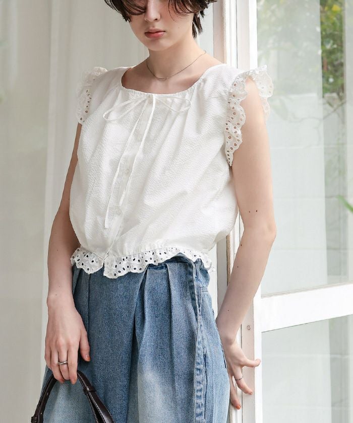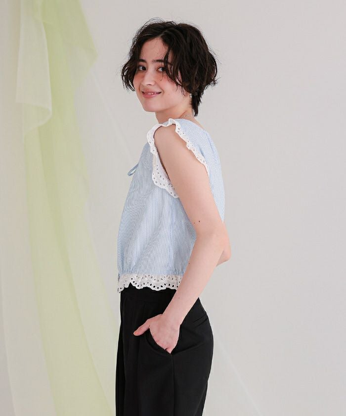 ・コットンレースをあしらった、フェミニンムード漂うノースリーブブラウス