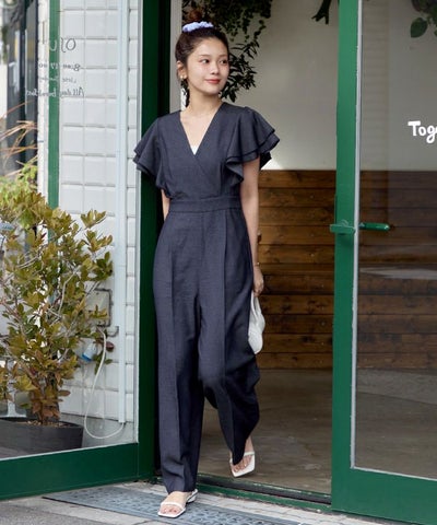 ・女性らしいカシュクールデザインが印象的な、上品なオールインワン